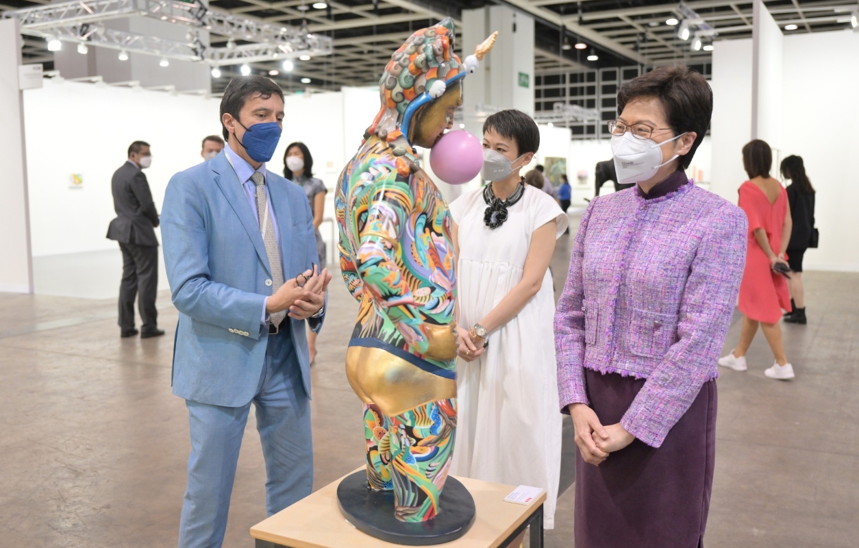 香港新聞網5月27日電 2022年巴塞爾藝術展(Art Basel)香港展會本周三(25日)起在香港會展中心一連三日舉行貴賓預展,並將在周六及周日(28日至29日)向公眾開放。香港特區行政長官林鄭月娥今日(26日)應邀到會展中心參觀巴塞爾藝術展。 林鄭月娥表示,時至今日,Art Basel香港展會已是本地文化界的年度盛事,深受本地以至海內外藝術愛好者歡迎。她本人幾乎每年都去參觀,既欣賞藝術家的作品,感受濃厚的文化氛圍,也表達對主辦機構和各參展畫廊的支持。