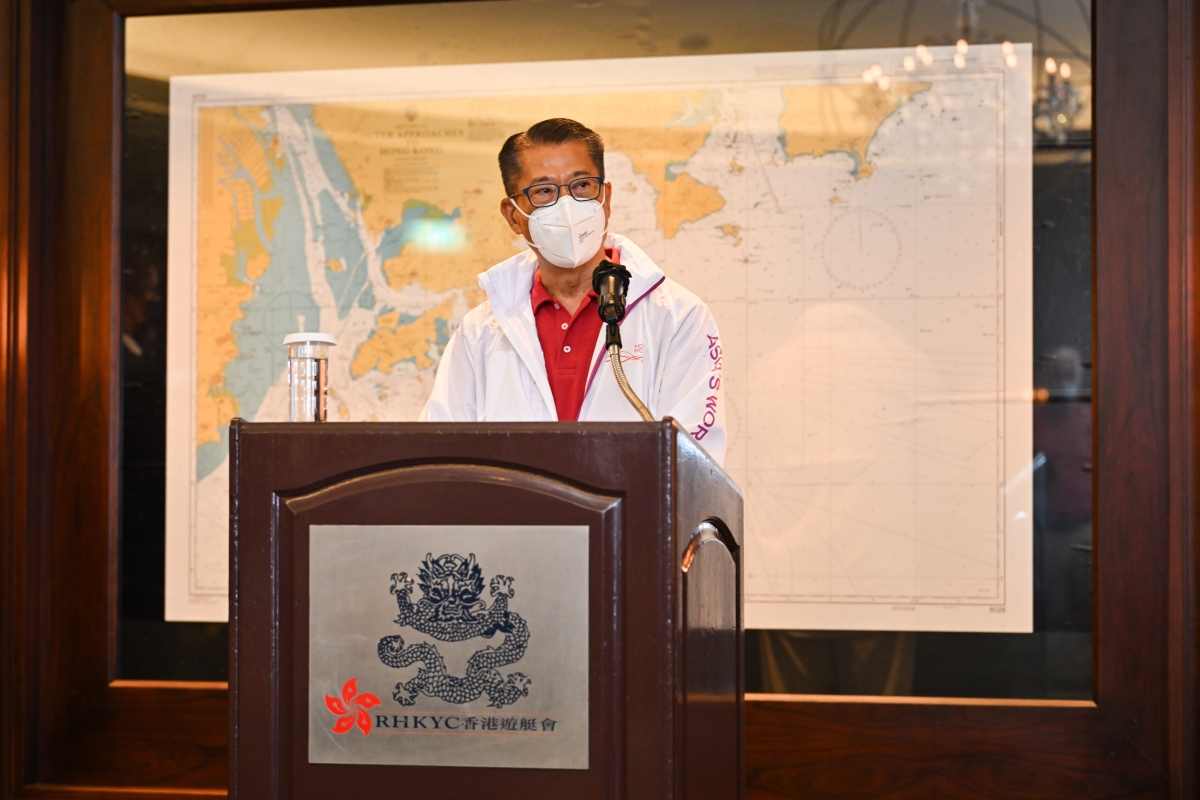 香港特區政府財政司司長陳茂波、香港立法會主席梁君彥、中國香港體育協會暨奧委會副會長霍啟剛等主持起航儀式。他們先後在磅礴大雨中揮起區旗,數十支帆船無懼風雨準時揚帆出發。 疫情兩年多,香港許多大型賽事停辦,現場見到不少體育界猛將趁此賽事跨界玩帆船。港隊前帆船運動員謝劭傑與多名港隊前單車女將組隊出戰,現場教學氣象“吃水深度”、升帆、壓弦⋯⋯