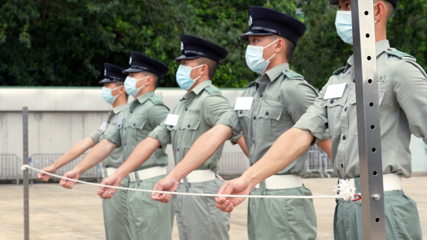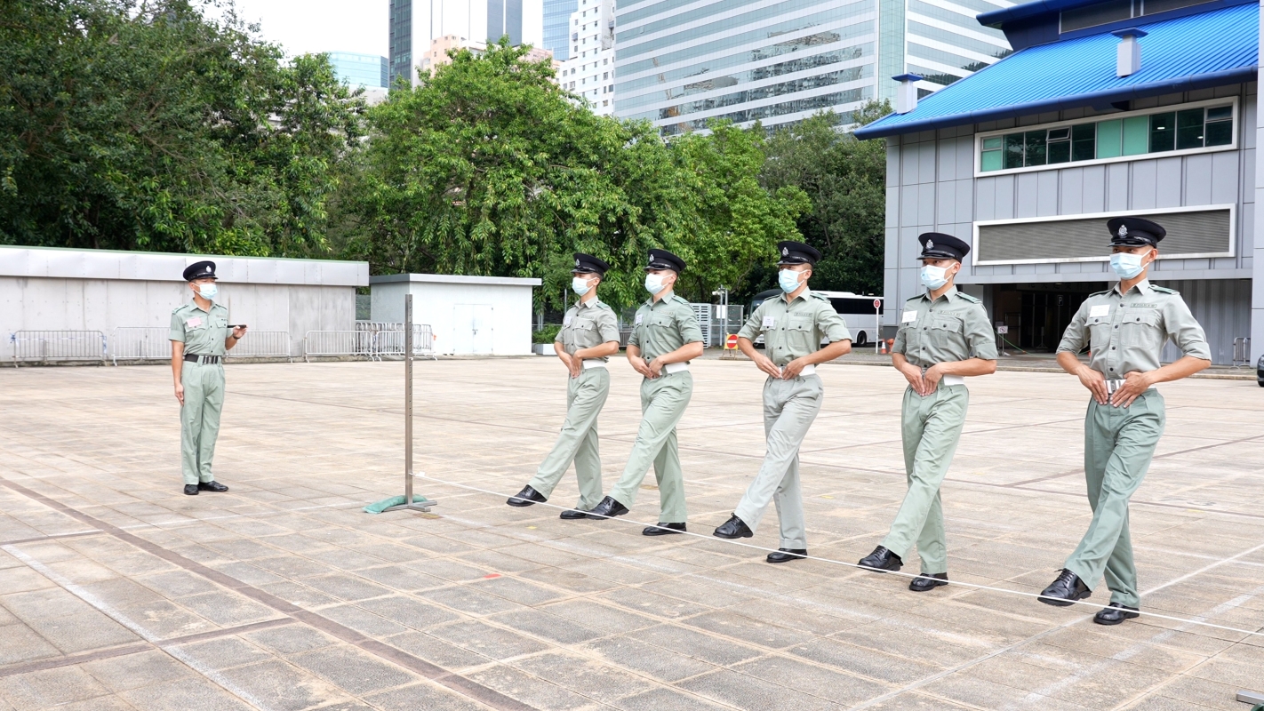 香港中通社圖片 為了學習中式步操,去年3月第一批警隊步操教官已經完成由中國人民解放軍駐港部隊培訓的中式步操訓練,他們也將所學傳遞給每一批學員。 在訓練學員的時候,教官會用繩拉起直線量度各個動作的整齊度,擺擘的幅度、槍枝的位置、腳掌和地面的高度都有嚴格標準。 六人一排排開,雙手收至腰帶位置,腿向前伸出,繃直腳背,“一、二、一”隨著口號換腿踢前,連一番動作乾淨利落,側面看去整齊劃一。 香港警隊曾在香港國安法實施後首個“全民國家安全教育日”首次向市民展示中式步操動作。