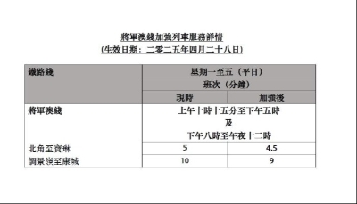 香港新聞網6月15日電 今日(15日)的香港立法會會議上,議員劉國勳就紓緩港鐵東鐵綫的負荷向運輸及房屋局長陳帆提出質詢,陳帆回應指港鐵已為東鐵綫額外採購三列列車,預計年底投入服務,到時繁忙時段的班次可由2.7分鐘加密至2.5分鐘。他表示,據推算,若進一步加大列車頻次至2分鐘一班,現時的34列車則需增至42列,港鐵將留意實際客流量適時進行規劃。
