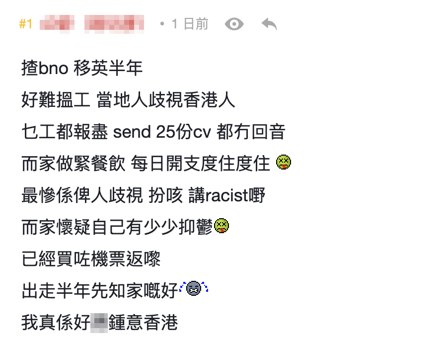 一名持BNO簽證移英半年的港人昨日(15日)在香港論壇上發帖大吐苦水,稱在英國找工作艱辛,投了25份簡歷、什麼工作都試過,但都沒有回音。最後該移英港人只得找了個不需要門檻的餐飲業工作,不過由於薪水卑微,每日開支需要精打細算。 “最慘是被人歧視!”爆料港人又哭訴在英國被當地人歧視,例如有人在他面前假裝咳嗽(註:一些外國人深信新冠病毒源自中國,故刻意在中國人面前咳嗽,搞種族歧視),或者說一些種族歧視的話。經歷種種令人不快的遭遇後,該移英港人甚至懷疑自己在英國被整出了輕微抑鬱,坦言“出走半年才知道家好,我真的好喜歡香港”,又自曝已經買了機票準備回流。