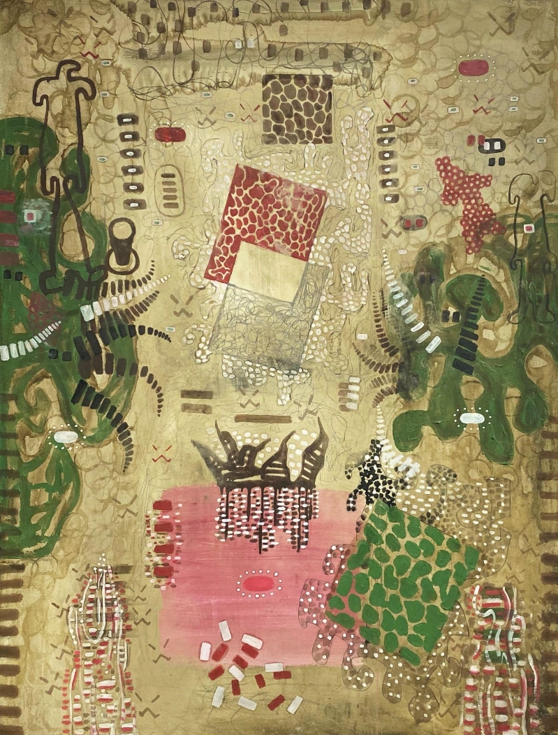 (相片來源:谷敏昭及明畫廊提供) 除此之外,首部曲展覽中的作品亦出現了剪紙、拓印等東方傳統技藝元素,融匯了“雅”(繪畫)與“俗”(民間工藝)兩者看似衝突及不相容的創作模式,讓畫作更為耐人尋味。 另外,符號、昆蟲圖案、雙喜、樹根等可容易被辨識的圖象,也以無定式的手法出現在谷敏昭的作品之中。藝術家引導觀者放下慣性思維, 在矛盾、不熟悉的語境中重新理解及定義這些圖象,由此帶來啟發,令看似普遍的圖象隨時間及語境而轉化。在探研及解構符號性的過程當中,谷敏昭的創作風格更趨多元,豐富了其視覺語言,令其創作更具維度。 《語意構造》系列——以繪畫探索未來