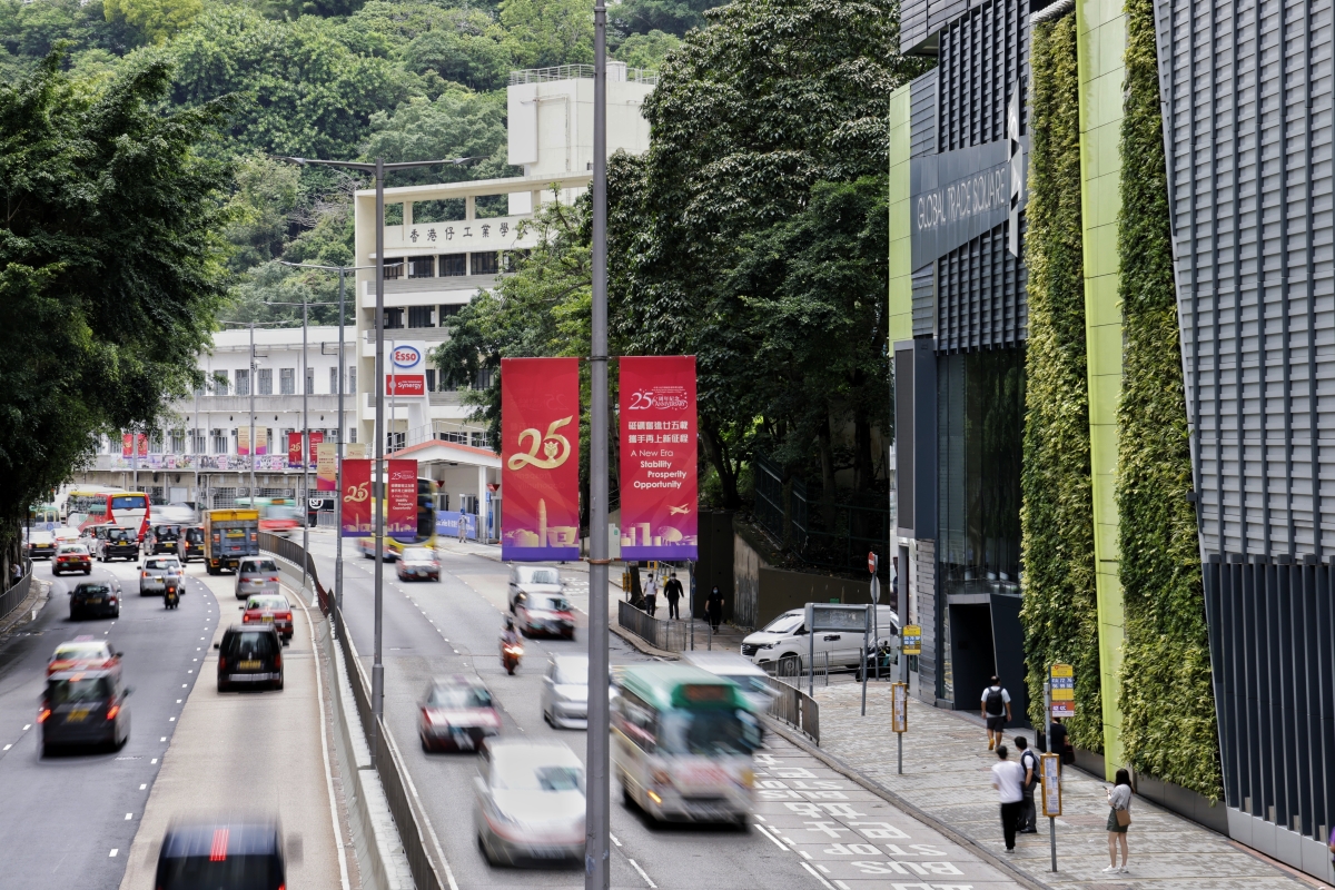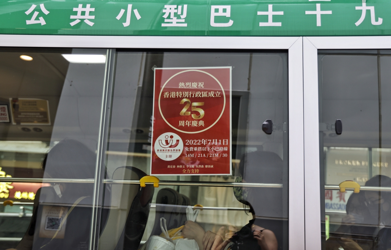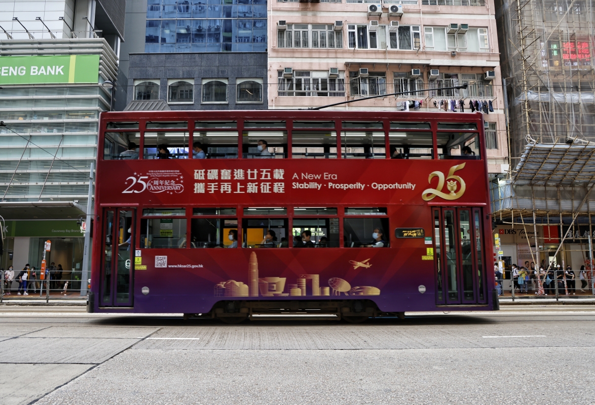 銅鑼灣多地貼出慶回歸標語。 行走在馬路中央,巴士、小巴、電車皆“換新裝”,穿上了慶祝香港回歸祖國25周年的外衣,連平日里緩慢行駛的電車都穿梭出紅火動感。 6月至8月期間,屈地街電車廠至跑馬地總站來回,新巴、城巴各條線路以及銅鑼灣線上多輛小巴都張貼上了慶回歸的車身廣告,且為慶祝回歸,7月1日香港市民可免費乘搭電車,多輛專線小巴亦為市民提供免費服務。