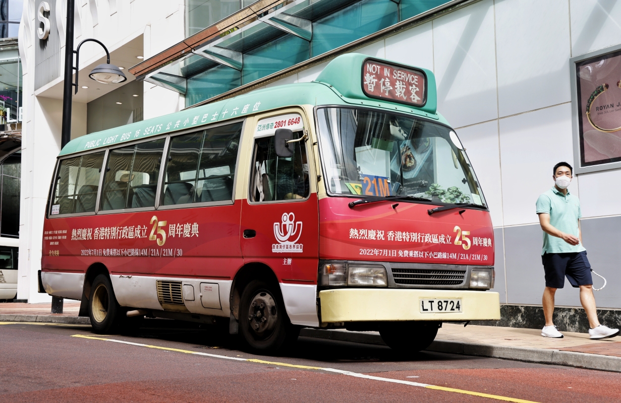 屈地街電車廠至跑馬地總站來回有多輛小巴貼出車身廣告。