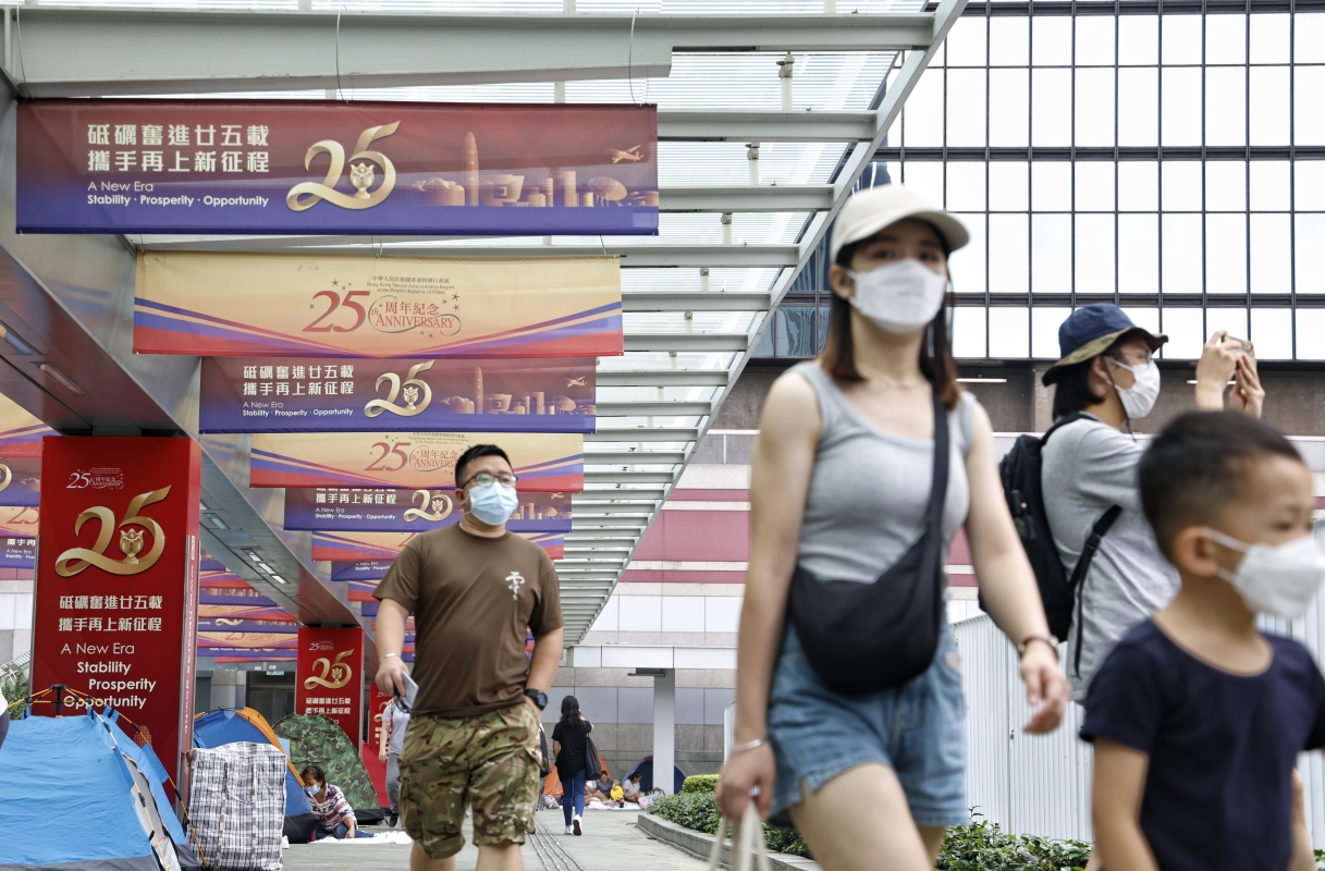 香港各區旗海飄洋。 2022年7月1日對於香港來說意義非凡,這一天,既是香港回歸祖國25周年的紀念日,也是新一屆特區政府履新的日子。近日,政府總部周圍圍繞大量慶回歸橫幅、彩旗。