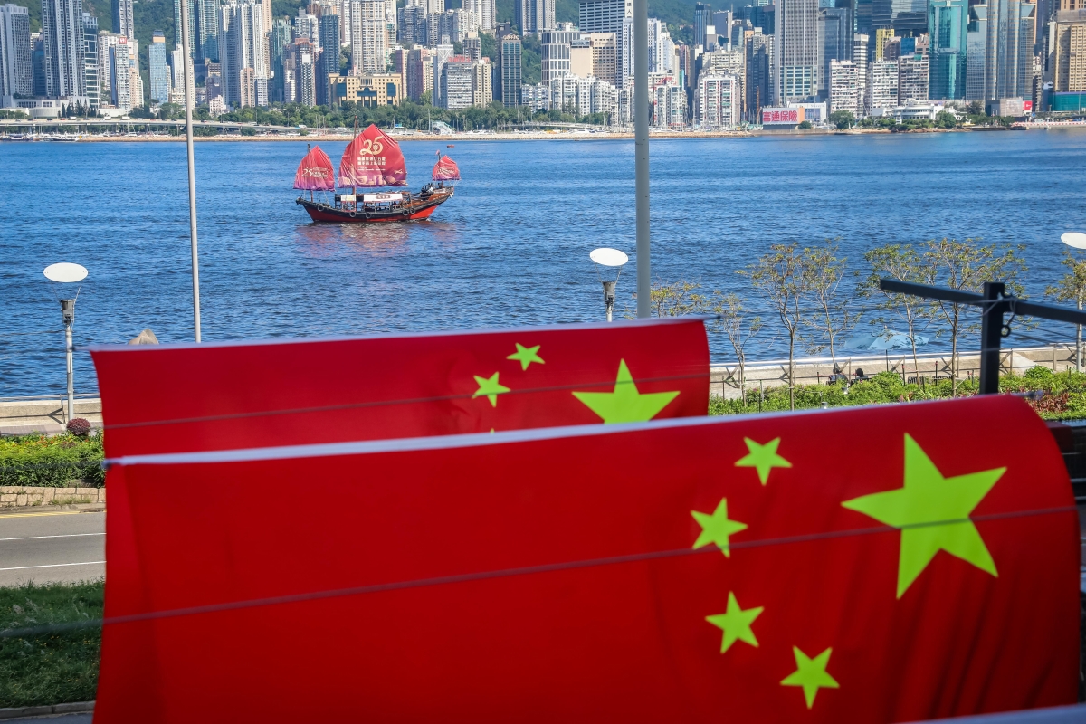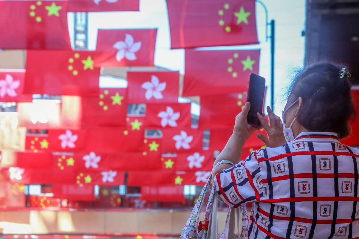 香港新聞網6月23日電 (記者 謝光磊) 香港回歸祖國25周年臨近,香港街頭一片喜慶氣氛。6月23日,逾百面國旗及區旗掛滿尖東街頭,市民抬眼便可見到一片鮮艷“旗海”。一艘掛著“砥礪奮進廿五載,攜手再上新征程”大型標語的船在維多利亞港海面航行,吸引不少香港市民駐足拍照。