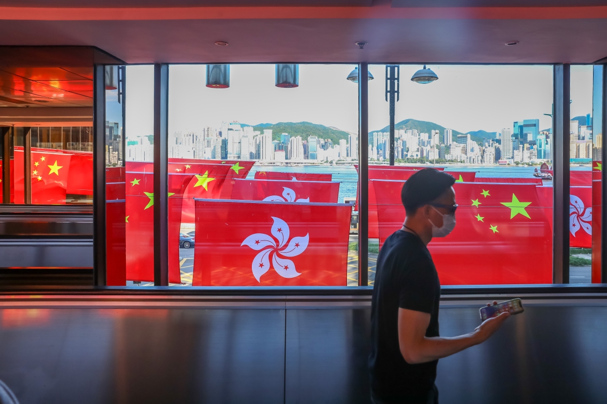 逾百面國旗及區旗掛滿尖東街頭。( 謝光磊 攝) 【編輯:謝光磊】