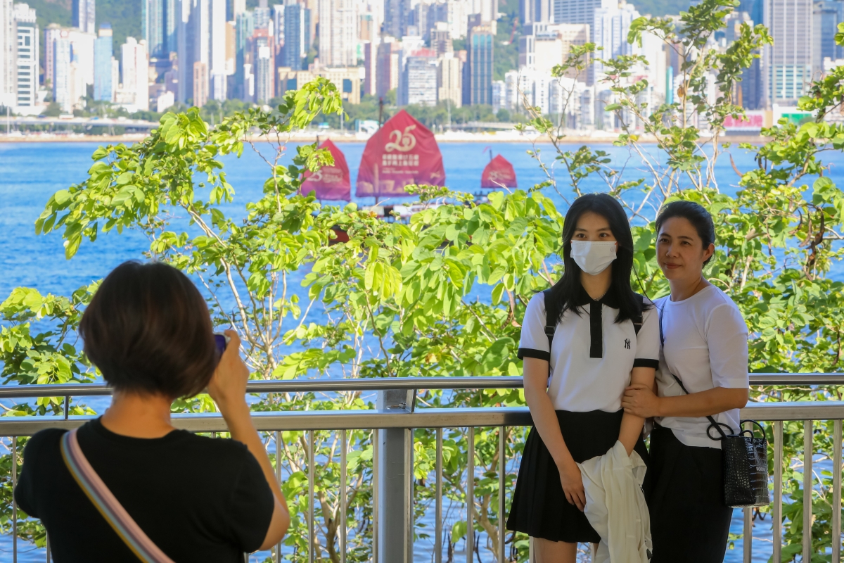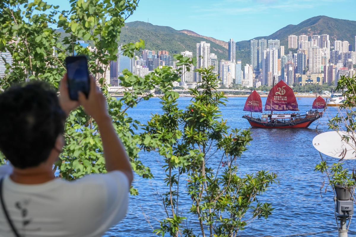 掛著慶回歸標語的船在維港海面航行,吸引市民駐足拍照。( 謝光磊 攝)
