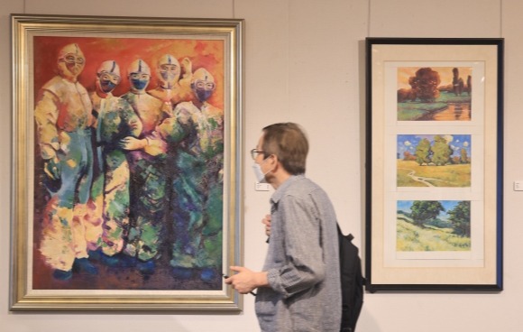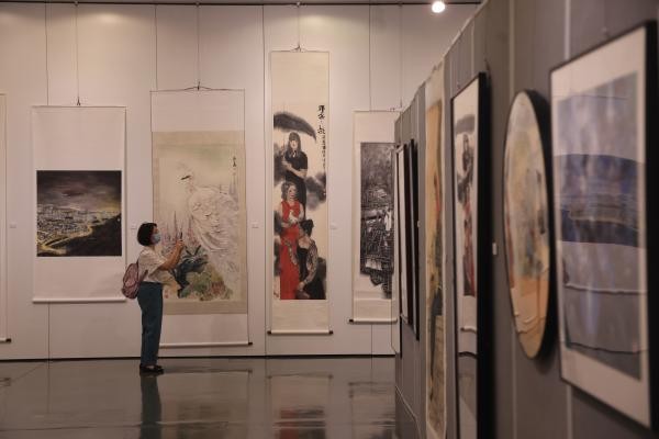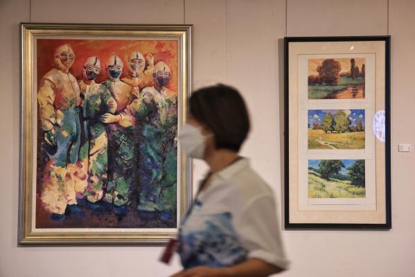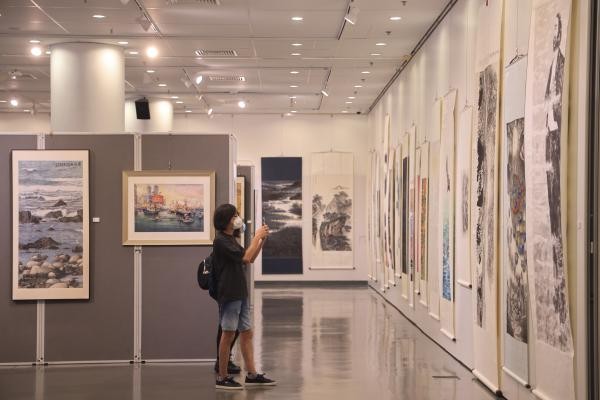 香港中通社圖片 是次展出作品包括,香港美協主席林天行的《走進大灣區》、副主席趙志軍的《輝煌時代》、常務副主席熊海的《獅子山下》等逾200位香港當代出色的中西畫家、雕塑家、新媒體藝術家的全新創作。有的鼓勵疫情時期前線奮戰抗疫英雄;有的留下香港大自然的景致印記;有的展現香港回歸25年當下的美好。 是次展出作品,均反映時代,撫慰心靈、感化人心,冀以藝術發揮凝聚精神力量的社會作用。不少港人及藝術愛好者前來參觀拍照,并與藝術家們現場取經。
