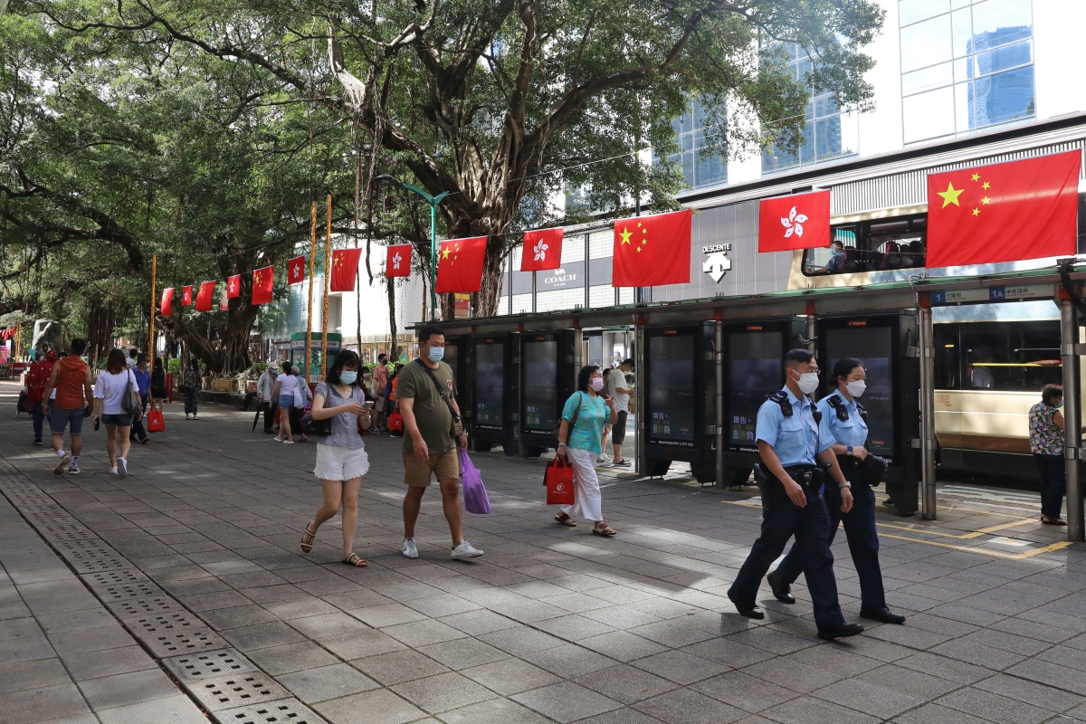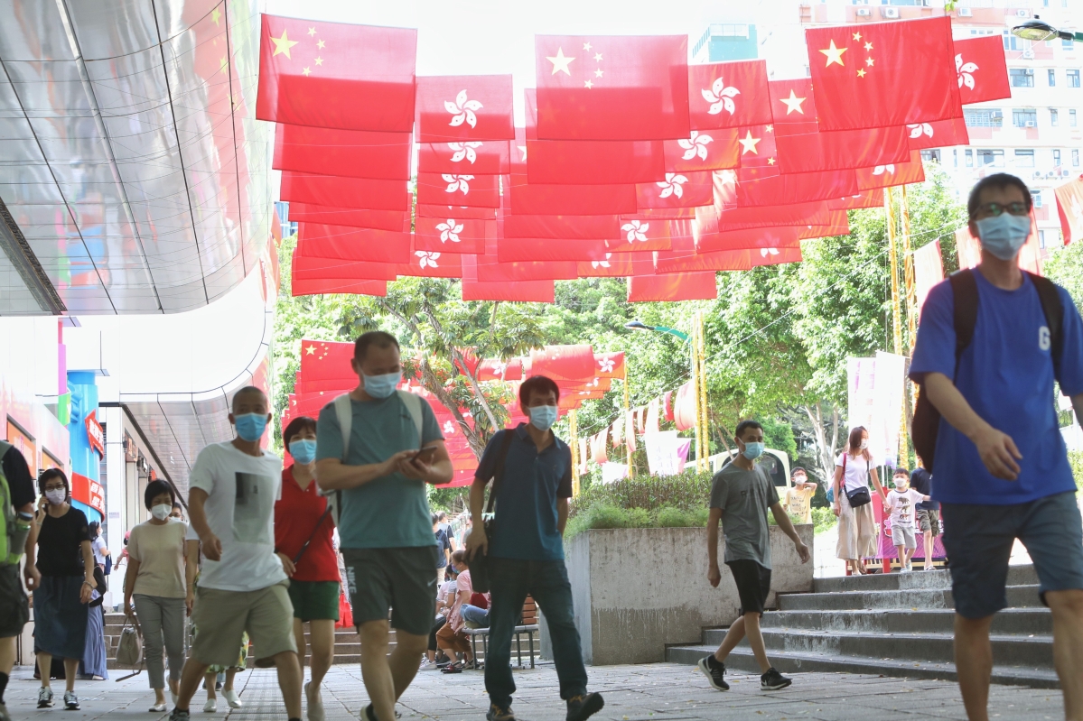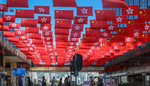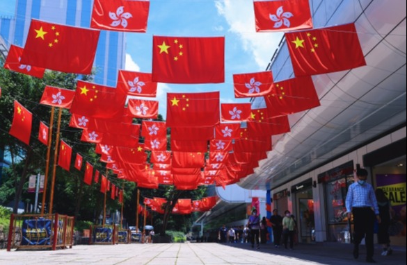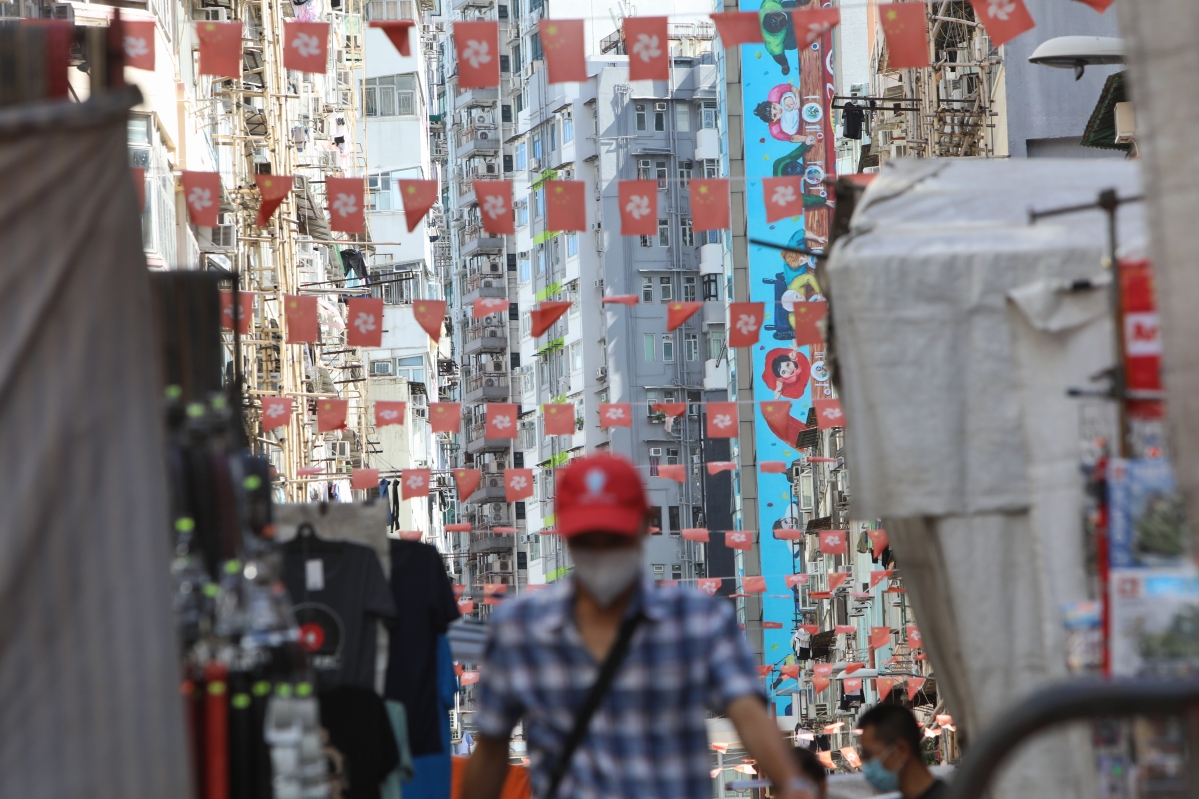 香港油尖旺街頭歡慶回歸呈現“旗海”