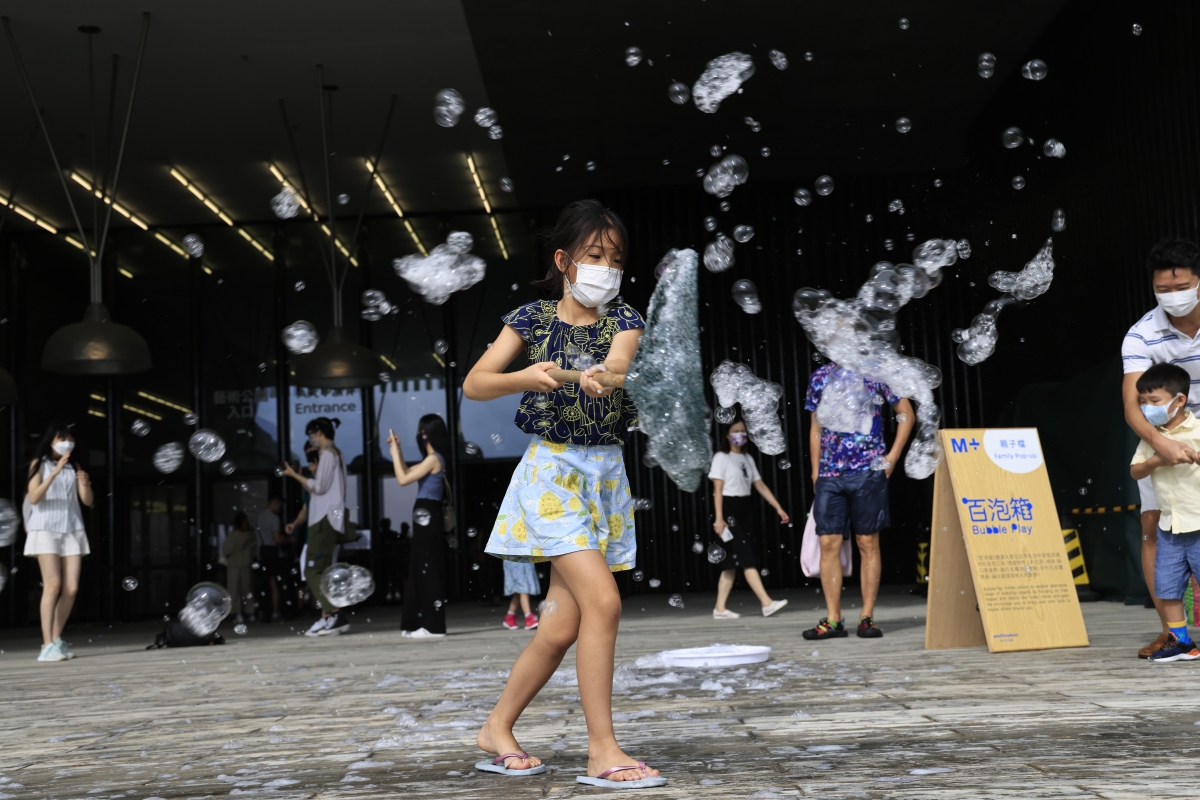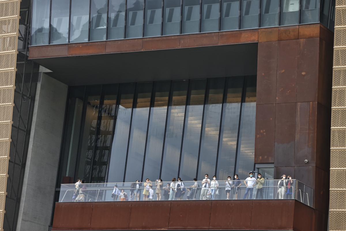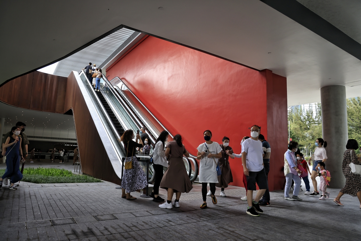 市民在館外有序入場。 是日下午,天朗氣清,西九文化區的草坪上,不少市民享受著周末時光,亦有數對情侶、新人在M+博物館門前取景拍照。