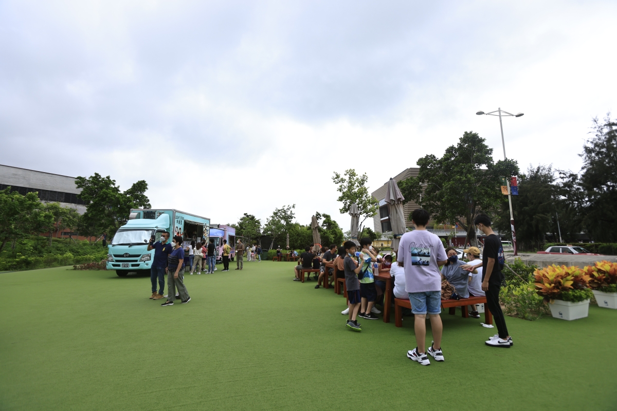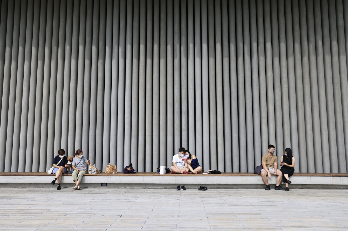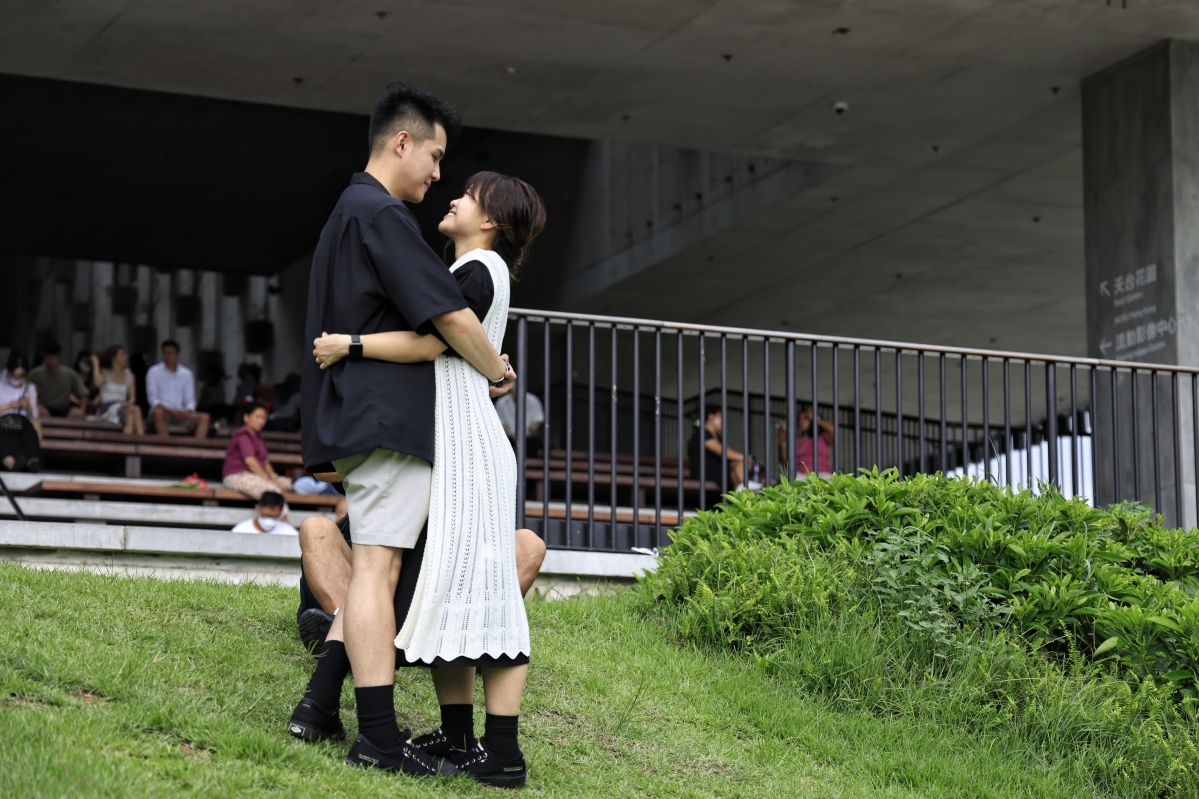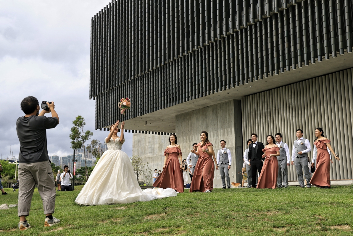市民在館外有序入場。 是日下午,天朗氣清,西九文化區的草坪上,不少市民享受著周末時光,亦有數對情侶、新人在M+博物館門前取景拍照。
