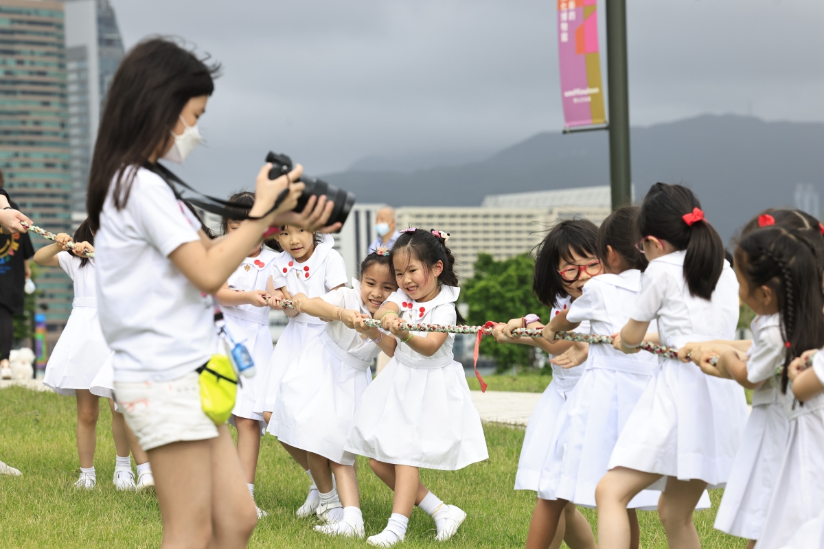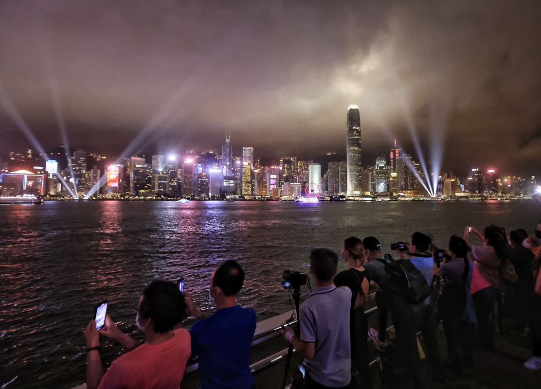 市民享受親子時光。 夜晚,因風球推遲的維港光影匯演終於亮燈。晚8時整,“幻彩詠香江”特別版之“維港光影匯演”如期上演,維港兩岸海傍多個地點發出光束燈,點亮香港的夜空,以璀璨的燈光配合激昂的音樂,舞動維港兩岸,維港畔百逾市民舉起手機,記錄這場視聽盛宴。