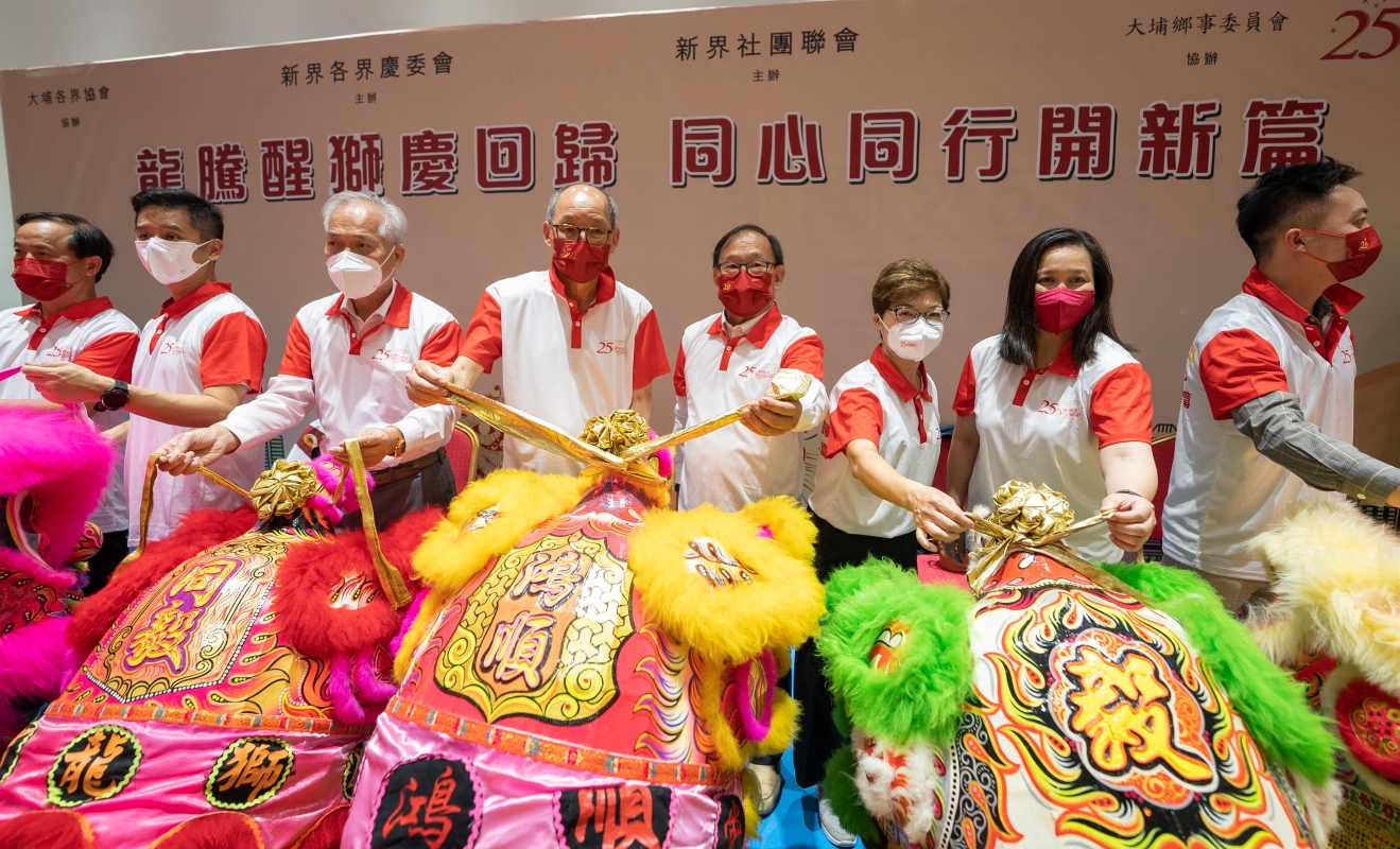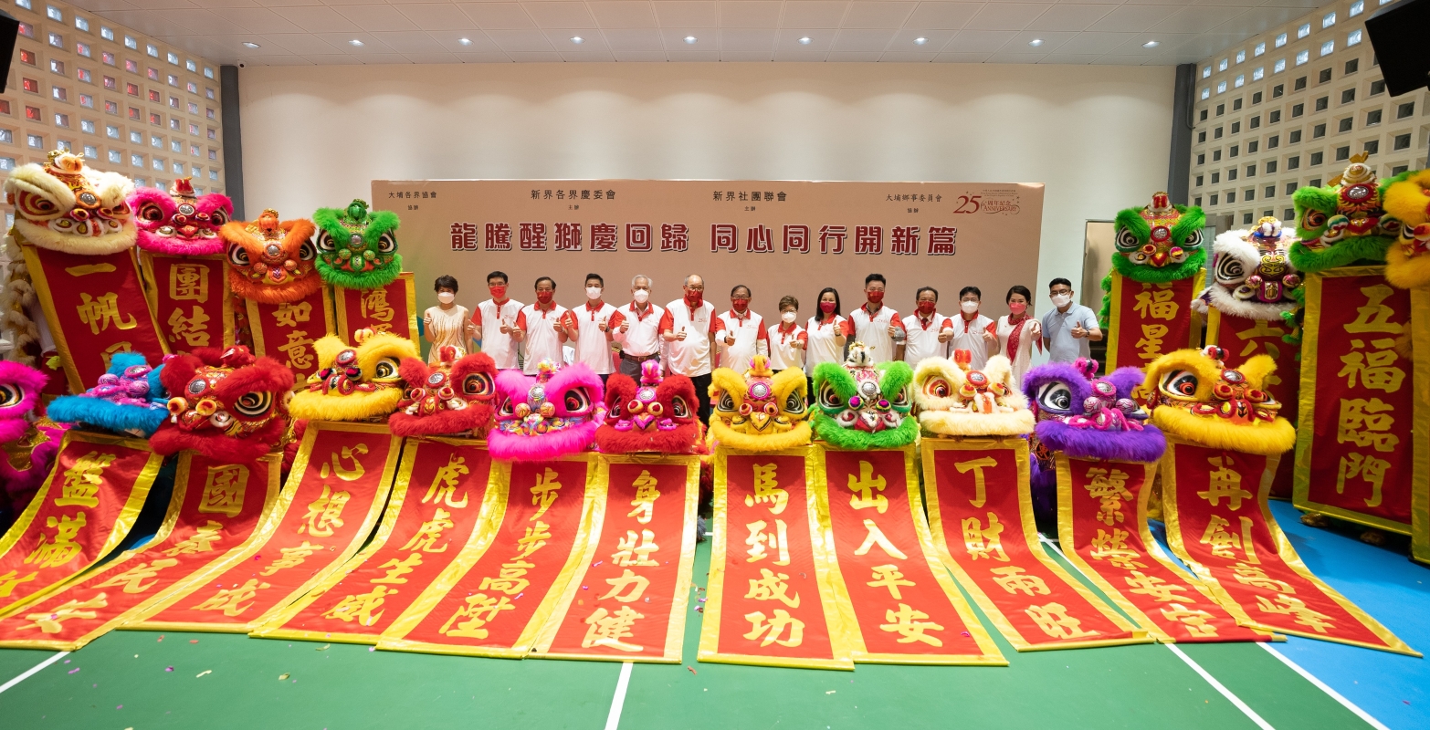 會場一片喜氣祥和,主禮嘉賓進行了金龍醒獅點晴儀式,為精彩演出拉起帷幕。在熱烈的鑼鼓聲中,25隻醒獅威武雄壯,追逐龍珠。另外,表演隊伍舞動五條祥龍行大運,象徵港人25年來同心同行,團結一致,融會貫通,努力打拼,祝福祖國繁榮強盛,香港欣欣向榮,廣大市民吉祥如意,同為香港開新篇。 本次活動由新界各界慶委會、新界社團聯會主辦,大埔各界協會、大埔鄉事委員會協辦,還得到新界發展基金會、新界鄉議局、香港工商總會等參與支持,與逾300位新界居民和義工一起歡度佳節。(完) 【編輯:李明珠】