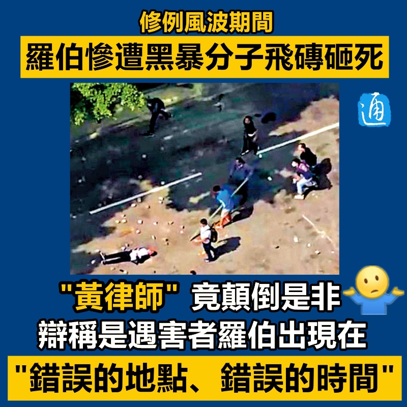 掟磚殺羅伯案|辯方竟稱羅伯“在錯誤時間地點出現”,是意外身亡香港新聞網7月11日電 黑暴分子於2019年11月在全港多區堵路破壞,期間七旬清潔工羅伯(羅長清)慘遭黑暴分子飛磚砸死。上周案件結案陳詞,“黃律師”為給暴徒脫罪時竟顛倒黑白,辯稱遇害者羅伯在“錯誤的地點、錯誤的時間”出現,其去世系屬意外。 對於這通赤裸裸的狡辯陳詞,一眾網民感到震驚且憤怒:“這麼沒人性的話都說得出口!”“殺人犯是不是都可以說是對方在錯誤的時間地點出現?”