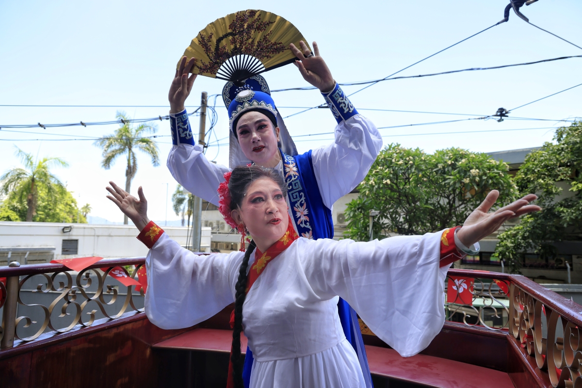 潮劇演員齊合影。 潮劇歷史悠久,是中國最古老的地方劇種之一,亦是國家級非物質文化遺產。啓動儀式結束後,電車從屈地街出發,駛向北角春秧街,潮劇表演演員坐上巡游電車進行表演和展示。
