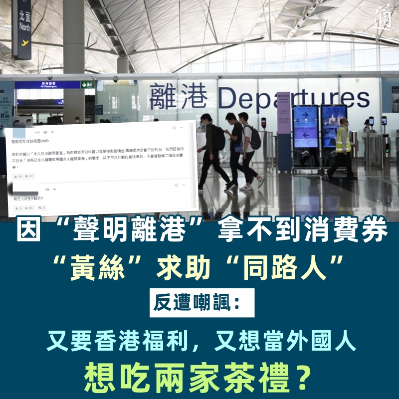 近日,一“黃絲”在亂港分子雲集的“連登”討論區發帖稱,朋友申請新一期消費券被政府駁回。收到的信息稱:“由於你曾以‘永久性地離開香港’為由提交有效申請以提早提取強積金或職業退休計劃下的利益,我們認為你不符合‘沒有已永久離開或意圖永久離開香港’的要求,故不符合計劃的資格準則,不會獲發第二階段消費券。” “跑路黃絲”覺得被政府“落下、無視”,其朋友則代為在討論區發帖尋求“同路人”幫助……豈料事情的走向卻令“跑路黃絲”始料未及!