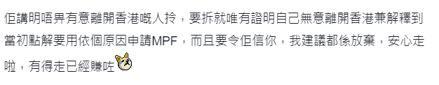 “(政府)講明不會讓有意離港的人領消費券,解決辦法唯有證明自己無意離港以及解釋當初為何要用這個原因提早領取強積金,還要讓它(指政府)信服。”有“黃絲”耐著性子勸誡該“跑路黃絲”,還是“安心走啦”。