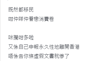 不過,大部分香港“黃絲”則是不滿 “同路人”既已竄逃外國,還心心念念地妄圖瓜分香港的消費劵等福利。 “又要拿香港福利,又要做外國人,想吃兩家茶禮(指一腳踏兩船)。”“跑路黃絲”“貪得無厭”的本性顯然惹毛了一眾斤斤計較的“黃絲”。有關帖文發出後,即遭留港“同路人”狠狠唾棄。
