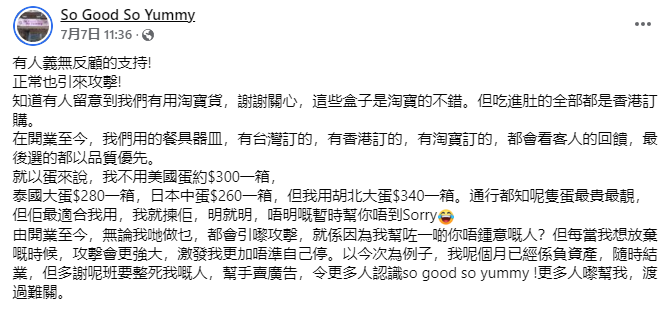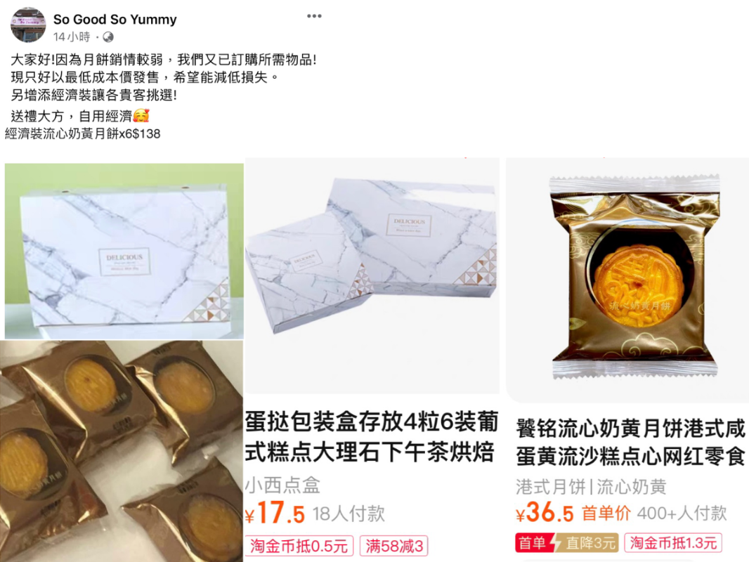 “黃店”發佈自家月餅圖片,被“連登仔”發現與淘寶貨一個樣 上周,“黃店”So Good So Yummy在臉書哀嘆月餅賣得不好,由於又訂購了所需物品,“為減少損失,只好降價出售月餅”,儼然一副要便宜“手足”的樣子。 不過,有“黃絲”發現該店月餅包裝盒、包裝紙與淘寶商品一個樣,疑似店家入了淘寶貨轉手再賣,而且是高價賣!該“黃絲”在連登爆料稱,淘寶同款月餅6個只要50.5元,加上禮盒17.5元,僅需68元人民幣,而“黃店”的“手足價”卻要138元港幣。 這條爆料迅速引爆連登評論區,引來眾多“手足”的口誅筆伐。 面對“黃絲”汹湧而來的質疑聲,“黃店”上周四(7日)發聲明,承認包裝盒確實是淘寶貨,但表示吃進肚的全都是“香港訂購”。 又指自己向來選購物料都以品質為基準,為了佐證這一點,“黃店”自曝不用日本蛋、美國蛋,而選用了全行公認“最貴最靚”的湖北蛋。