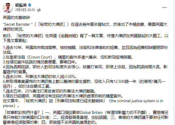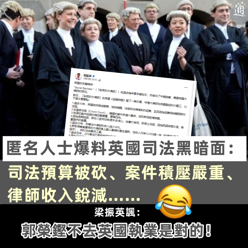 此外,“秘密大律師”還稱,過去20年,英國刑事法大律師的收入減少28%,那些新近取得專業資格的大律師,又往往要背上數萬英磅的學生貸款,偏偏他們的收入只有12500鎊一年(換算月薪約港幣1萬元),低於當地的法定最低工資。 因此,過去五年,25%專注打某些官司的刑事法大律師已經離職。今日,英國已沒有足夠的刑事法大律師處理當前積壓的案件。 “(英國)刑事司法制度已經支離破碎(the criminal justice system is in pieces)。” 該“秘密大律師”毫不客氣地總結。 對此,香港前特首梁振英在臉書發文稱,“這個故事教育我們:一,英國口頭說要做Global Britain(有環球影響力的不列顛),實際只有能力做美國的口水佬;二,經濟發展是基礎,空談誤國;三,香港的大律師請不要做任何影響香港經濟發展的事……” 他還揶揄近年竄至加拿大、美國的前立法會議員郭榮鏗“不去英國執業是對的。”