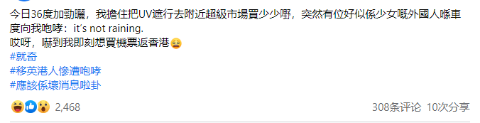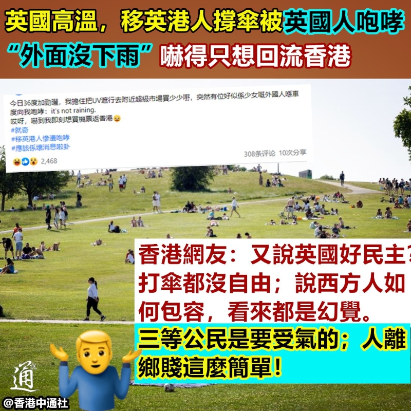 香港新聞網7月20日電 為所謂“自由”奔赴西方的人,抵英後卻連“撐傘的自由”都沒有了? 近日,一名移英不久的香港人在社交媒體臉書分享於英國生活的“囧事”,稱在英國氣溫攀升至36度的一天,自己撐著遮陽傘去附近超市買東西,未料遇到一名外國女人衝她咆哮“外面沒下雨(指沒下雨就不該撐傘)!” “嚇到我即刻想買機票回香港。”該移英港人“驚魂未定”地寫道,文末,還添加了“移英港人慘遭咆哮”的標籤。