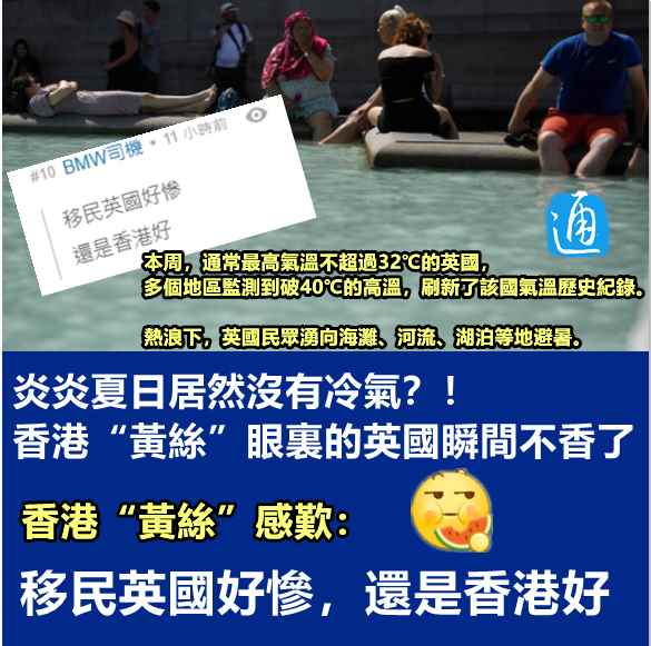 香港新聞網製圖 本周,通常最高氣溫不超過32℃的英國,多個地區監測到破40℃的高溫。當地時間7月19日12時50分,英國倫敦希思羅機場首次錄得突破40℃的高溫。當天下午,聖詹姆斯公園、邱園等倫敦其它地方的觀測溫度都超過40℃。此外,英格蘭林肯郡康寧斯比觀測到40.3℃的高溫。 受高溫影響,多地發電設備無法正常運轉,在約克郡、林肯郡等地,成千上萬人家中停電……熱浪下,人們湧向海灘、河流、湖泊等地避暑。 在世界很多地方,大部分人夏季已經習慣將空調和西瓜作為“標配”,但英國屬溫帶海洋性氣候,最高氣溫通常不超過32℃,這裏的居民習慣於與寒冷、而非熱浪做鬥爭。對英國人來說,空調十分陌生,連空調普及度的相關數據都很少。 此輪熱浪也讓另一個特殊群體——移英“黃絲”,同樣措手不及。不同的是,他們對空調可以說相當熟悉。 讓人記憶猶新的是,2019年8月,一些非法示威者湧進太古地鐵站進行示威。然而隨後尷尬的一幕發生了,阻礙了地鐵站正常運營的示威者開始齊聲大喊:“開冷氣!開冷氣!開冷氣!開冷氣……”原來是有人悄悄將地鐵站的空調關了。 可以說,一旦離開空調,這些非法示威者鬧事的意願都將大大降低。 有人就總結稱,香港人沒有冷氣會死。而且香港的空調還有一個特點,那就是在香港,空調都開得非一般的涼快!無論是夏天還是冬天,商場、大學教室、電影院、辦公室、餐廳、地鐵等室內的空調都會不厭其煩地運作著。 持續高溫令習慣了吹空調的移英“黃絲”叫苦連天。近日,他們在經常聚集的“連登”討論區哀嚎,直呼“想回香港避暑”,自由民主的英國瞬間就不香了。 有“連登仔”一邊吹著空調一邊感嘆:“移民英國好慘,還是香港好。” 【編輯:胡雪石】