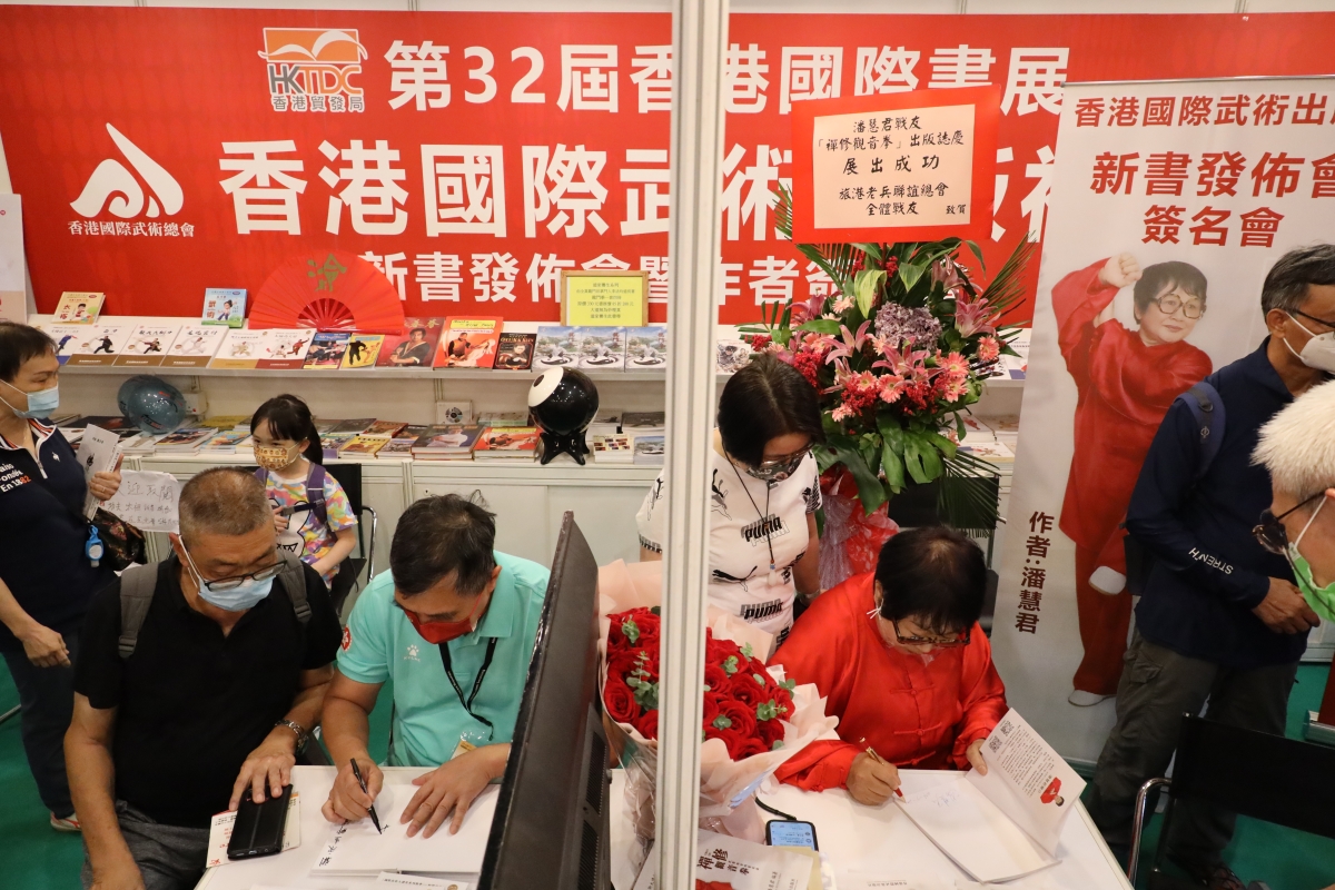 潘慧君與太極拳名家林文輝在為讀者簽名。 第三十二屆香港書展於7月20日開鑼,一連七天的書展於香港會展中心舉行。今年書展的“年度主題”為“歷史文化·城市書寫”,並以“從香港閱讀世界:憶·寫香港故事”點題,大會將從不同角度介紹與主題有關的優秀作家及作品,與書迷攜手探索香港歷史和文化軌跡,推動全城閱讀風氣。(完) 【編輯:洪少葵】
