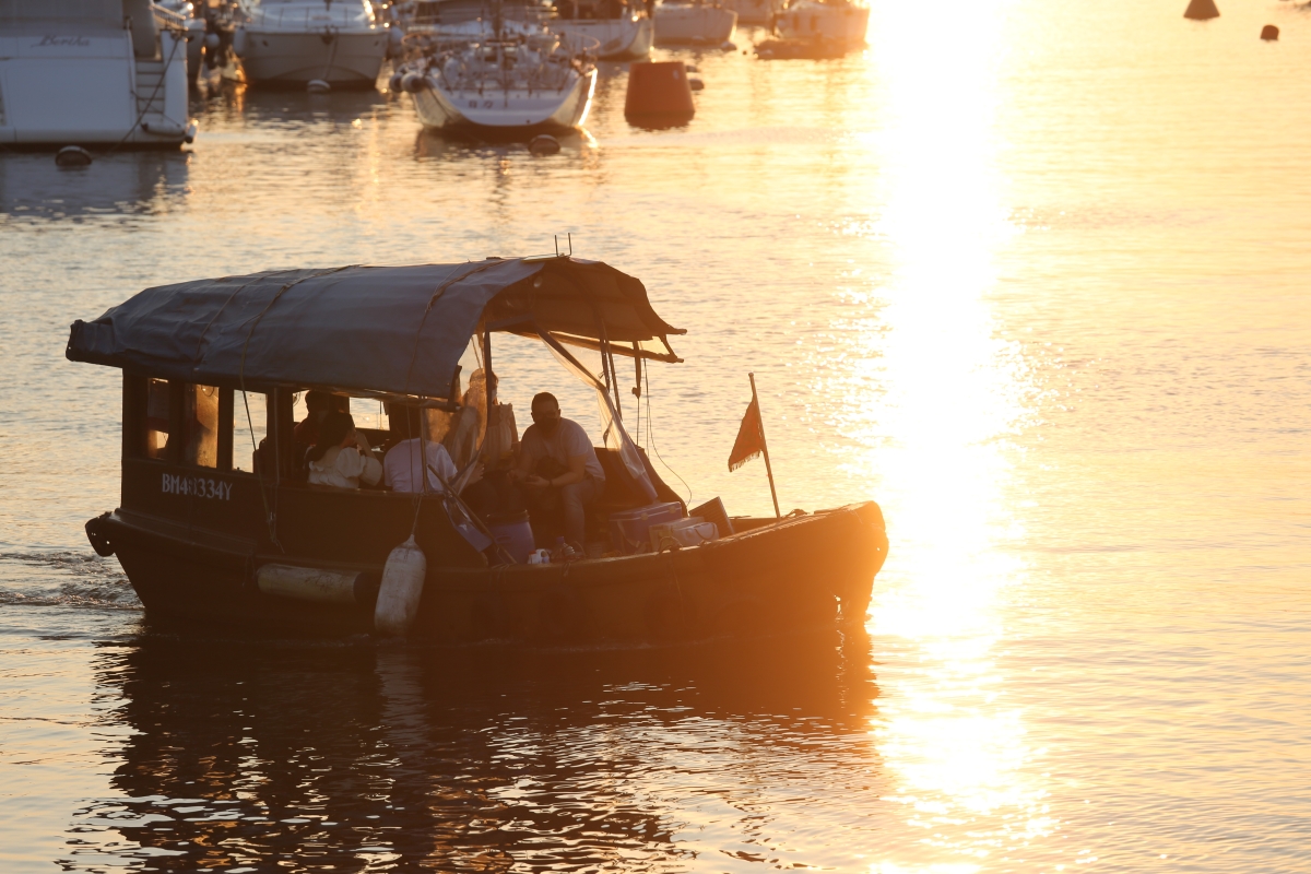 避風塘內的擺渡小艇在夕陽下行駛。