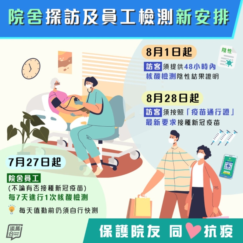 (圖片來源:添馬台) 特區政府將安排指定檢測承辦商,為院舍提供檢測套裝供員工自行進行採樣,並會於指定日期到院舍收回樣本。員工亦可選擇親身到全港各區的社區檢測中心或流動採樣站免費檢測。與此同時,所有院舍員工仍須繼續在每天值勤前,自行進行快速抗原測試,測試結果須為無染疫方可如常上班,以保障員工及住客的安全。 此外,所有探訪人士下月1日起,必須持有探訪前48小時內核酸檢測陰性證明;下月28日起,訪客須按照“疫苗通”最新要求接種疫苗。 【編輯:張琦】
