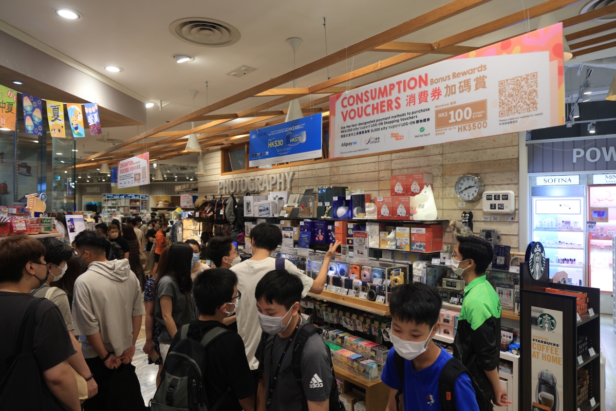 香港新聞網8月7日電(記者 許其皓)香港特區政府8月7開始向約636萬名合資格市民分期發放2022年第二階段的消費券,涉款總額逾300億港元。其中,約15萬名合資格的新登記香港永久居民或新來港人士,將分期獲發1萬港元消費券。與以往不同的是,本次通過不同優才、專業人士及企業家入境計劃等來港居住,以及來港升學的人士亦獲派消費券。 當日正值周日,香港各處掀起了“消費熱”,大街小巷都可以見到商戶張貼支持消費券消費的標識,同時有商戶加推優惠吸引市民消費。不少剛領到新一期消費券的市民趕忙前往商場、超市消費。