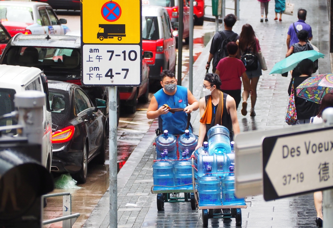 送貨工人在冒雨工作。