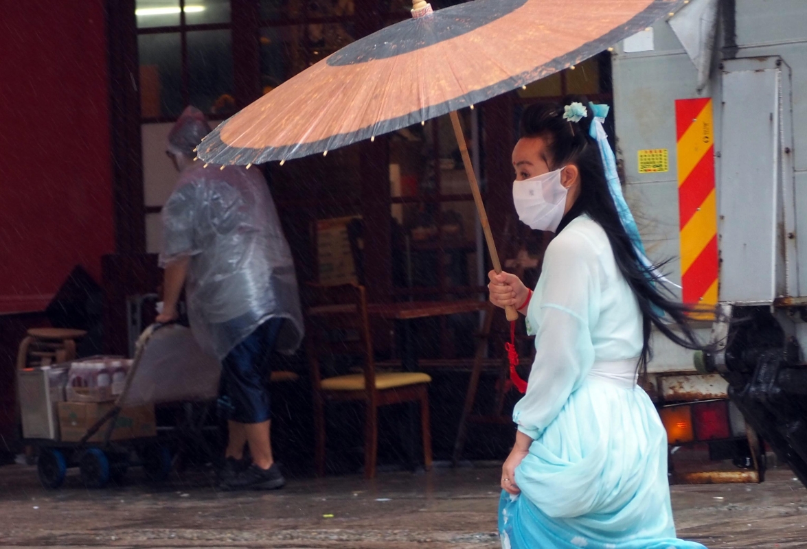 一名穿著漢服的女士匆忙趕路。
