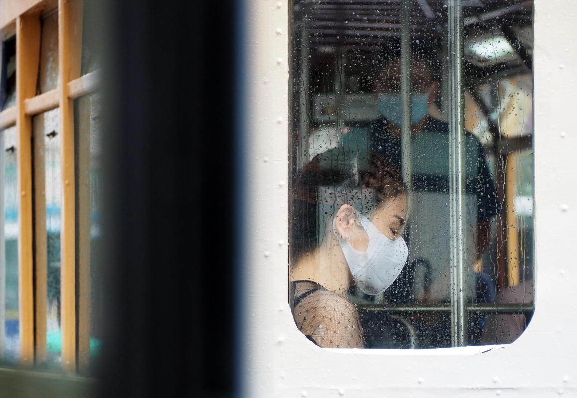 市民乘電車冒雨出行。