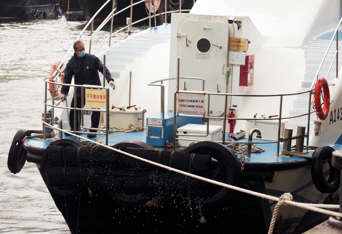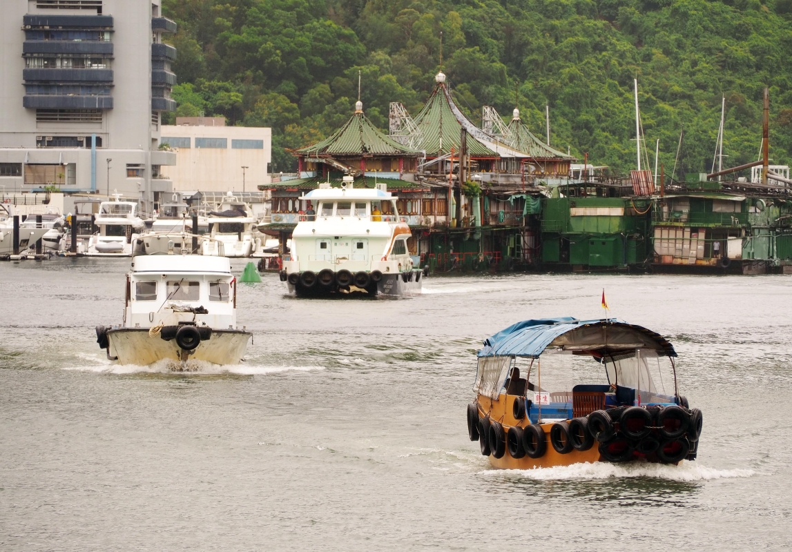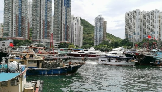 漁船、遊艇入港,在香港仔避風塘停泊船隻。