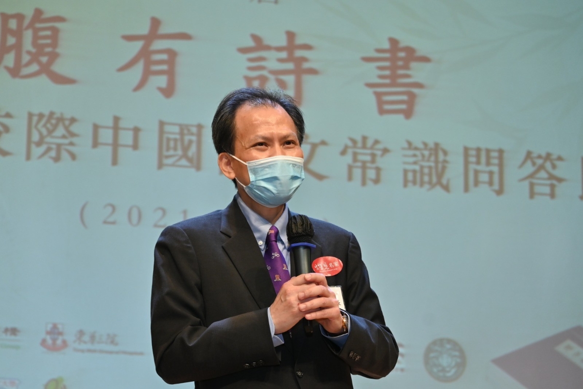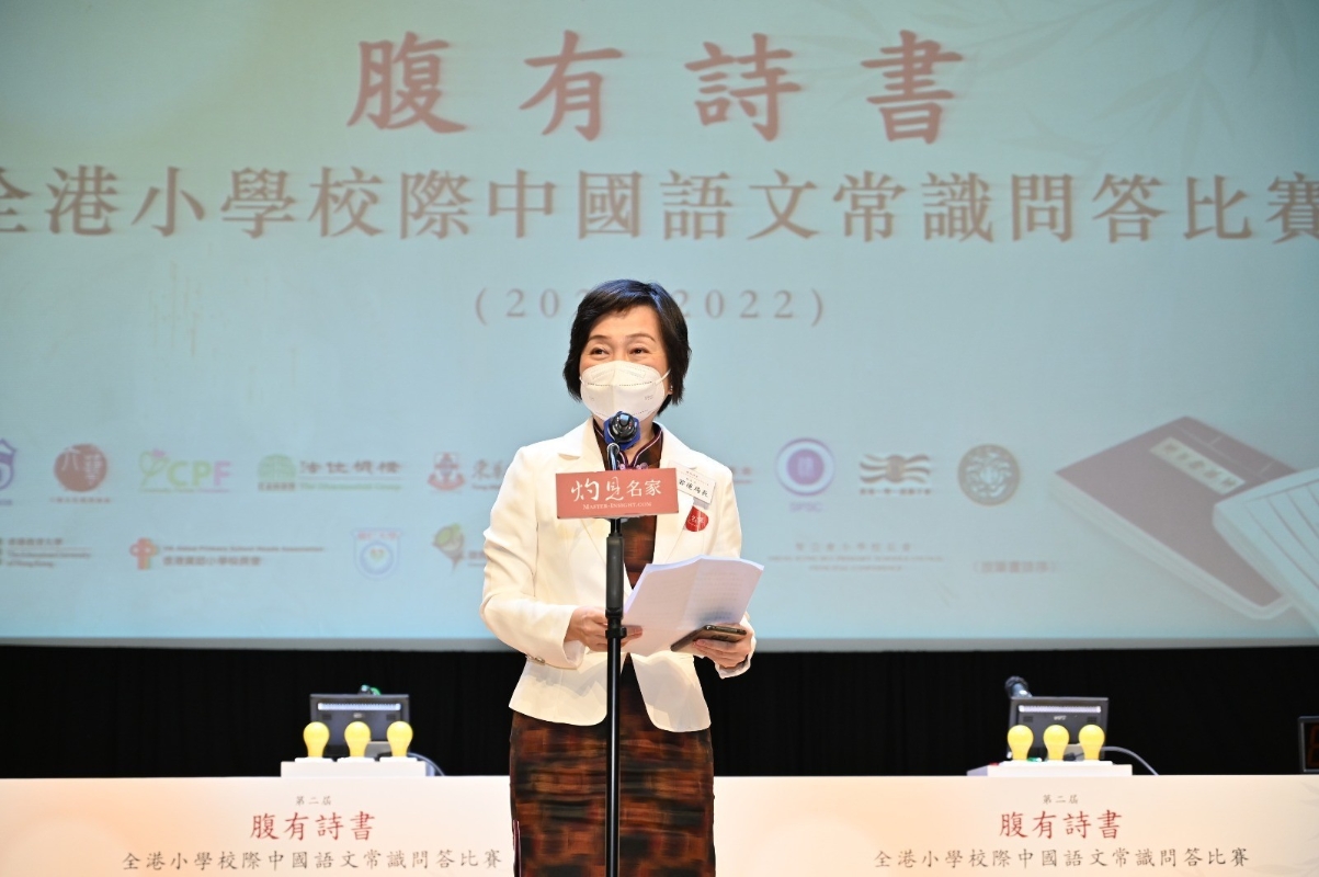 文社長表示,今年很榮幸邀請到新任教育局局長蔡若蓮博士擔任主禮嘉賓,蔡若蓮局長本科在浸會大學修讀中文,其後在中文大學先後取得中文教育碩士及博士學位,當上校長後致力推廣中國語文知識,是主禮嘉賓的不二人選。而連續第二年舉辦比賽,他認為學生最大的得益是能有趣地將中國文學史溫習一遍。他形容當年修讀劉大杰編著的《中國文學發展史》十分枯燥,領略當中的精華並不容易。現在則有許多科技幫助學生學習,當中包括施仲謀教授新近出版的《詩詞欣賞與品德情意》,以輕鬆的手法介紹詩詞,施教授並捐贈十多本著作作為今年得獎學生的禮物。 他表示,近年多家大專院校積極推廣中國文化知識,特別是在施仲謀教授帶領下,教育大學先後出版了《三字經》相關書籍,也是此次比賽的參考讀物,相信同學讀熟後上陣就不需要擔心,也提升了閱讀的境界,像是走了一趟中國傳統文化之旅,包括文學、歷史、地理知識,甚至是國際關係,無形中學到了許多東西,學得開心,玩得開心,希望能藉由比賽將中華文化發揚光大。 蔡若蓮:歷史文化是我們的根,也是維繫民族團結的基石 主禮嘉賓教育局局長蔡若蓮博士在致辭時表示,“腹有詩書”出於蘇東坡的詩句“腹有詩書氣自華”,即熟讀詩書可以提升人的修養,由內而外流露出來。她指出,蘇東坡是她最喜歡的大文豪、書法家、政治家,對農業水利也有貢獻。他比莎士比亞早出生 500 年,是當今最多人研究的文學家之一,足證中國文化有獨到的吸引之處,因此她自己也非常喜歡中文。