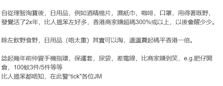 憶述過往,她透露會在香港本地店鋪購買手機指環、保護套、充電線等物品,這些商品標價約100元3件或5件。但自她學會網購後,才發現貨物可以這麼便宜,原來香港商家“水這麼深”,並估計對方能獲利300%或以上。 “之前年少無知,花了不少冤枉錢,以後就會聰明一些……”該網友最後感慨。