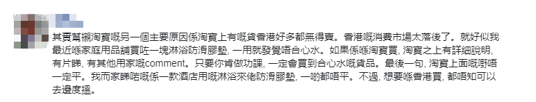 也有網友認為,淘寶上的物品不一定便宜,但想要什麼都能搜到,而且內地購物平台有詳細的使用說明、視頻講解和買家評論。由此,他忍不住感歎“香港的消費市場太落後了……”