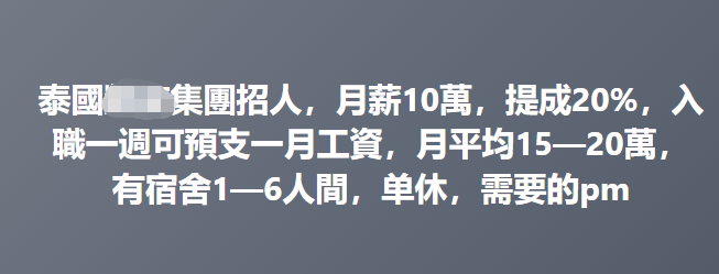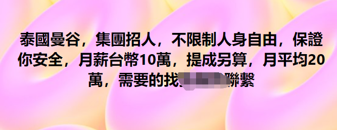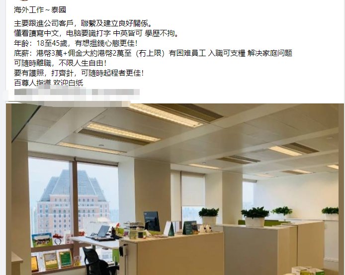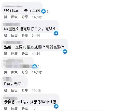 圖片源於網絡 記者發現,在香港社交媒體專頁,有多條“海外賺快錢”的招聘廣告。其中一個帖子寫著“主要跟進公司客戶,聯繫及建立良好關係。懂看讀寫中文,电脑要識打字,中英皆可,學歷不拘。底薪:港幣3萬+佣金大約港幣2萬至無上限。” 但網友可謂“人間清醒”,不少網友指出:“一去沒回頭”、“為何一定要18至35歲?賣器官?”、“泰國只是中轉站。” 記者查閱網站發現,香港通過多條不同的香港法例應對販運人口活動。在政策層面上,政府於2010年成立一個由保安局領導的“跨部門打擊販運人口工作小組”,以加強打擊販運人口活動的執法策略。在行動層面上,政府於1998年成立“跨部門聯合調查隊”,以便相關部門在日常行動中就販運人口活動交換情報,並進行聯合調查合作。(完) 【編輯:李明珠】