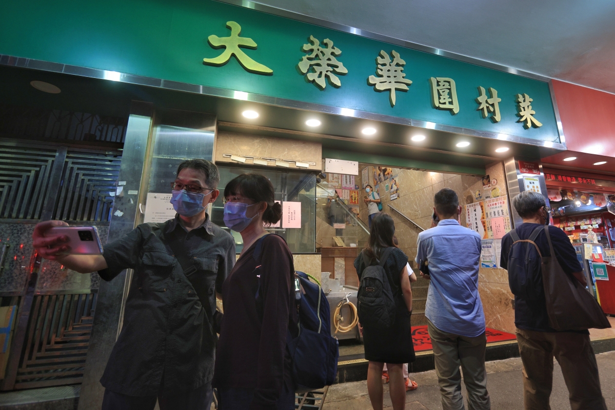 市民在灣仔“大榮華圍村菜”門口拍照留念。有55年歷史的灣仔“大榮華圍村菜”,將於8月28日關門大吉。