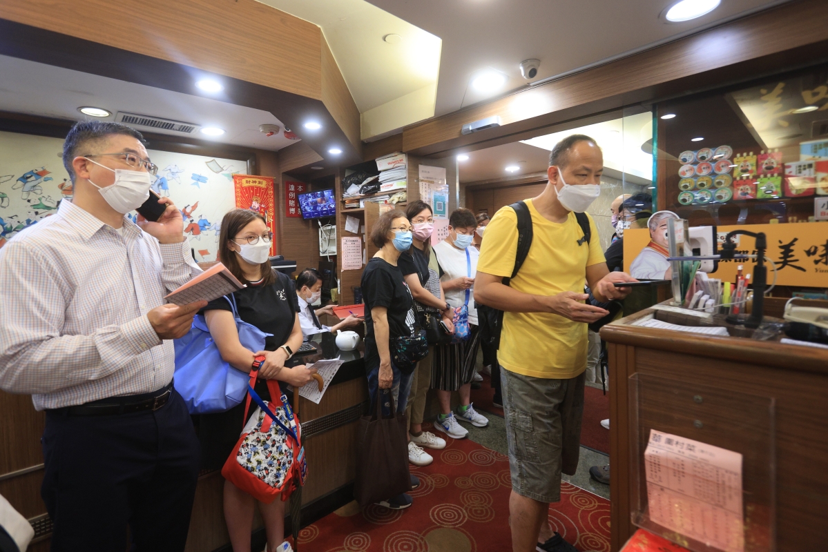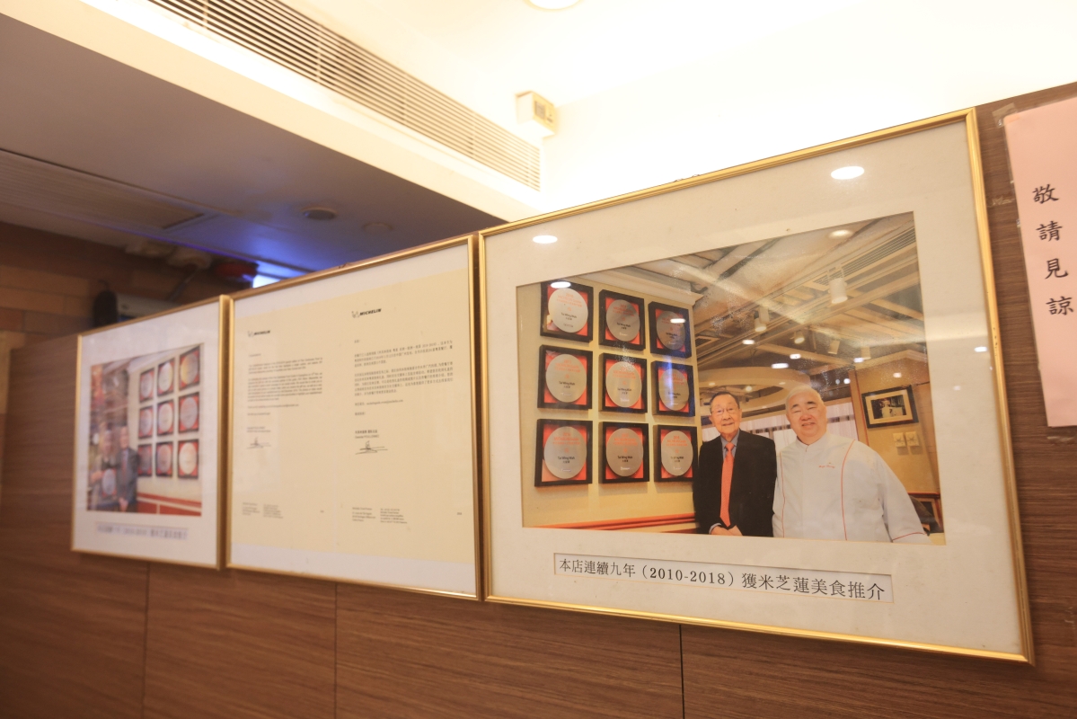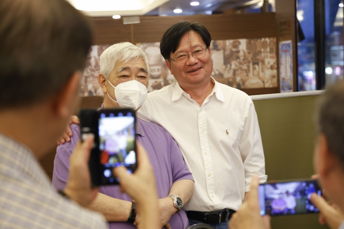顾客與大榮華董事總經理梁文韜(韜韜)(左)合影。梁文韜表示,疫情下遊客絕跡導致生意大跌,老牌酒家在灣仔將成為絕唱,將按勞工法例遣散全部約60名員工。