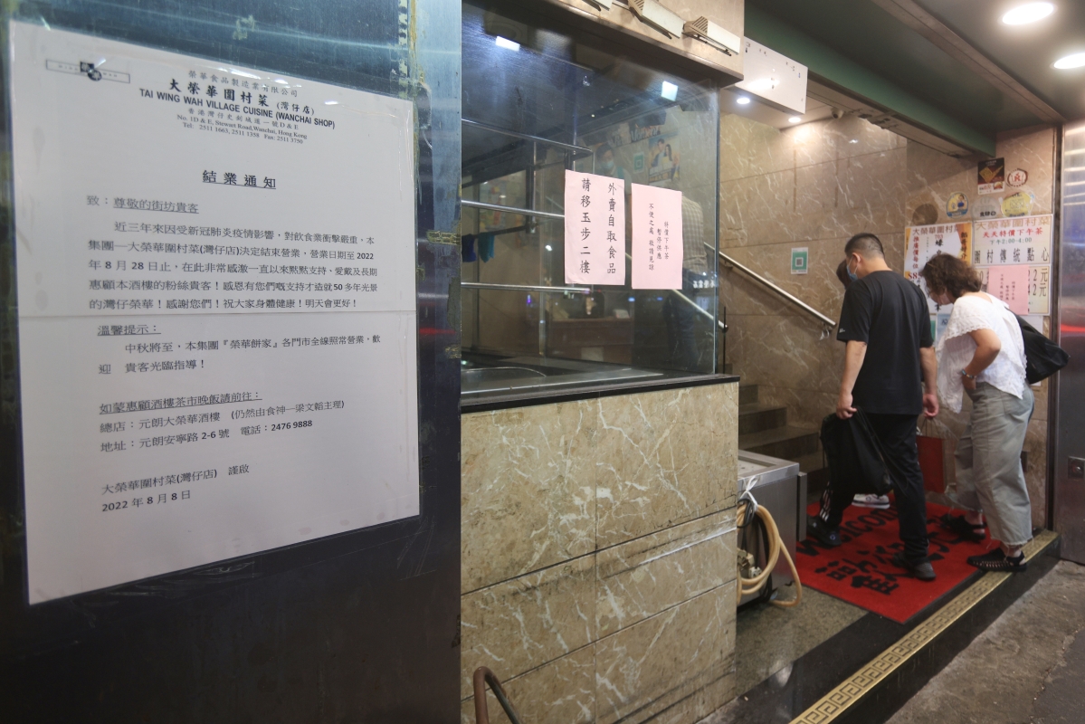 香港新聞網8月19日電(記者 許其皓)受新冠疫情的影響,近三年來香港飲食業大受打擊,多家老店相繼結業,老字號酒樓灣仔“大榮華圍村菜”也在近期宣佈將於8月28日結業。近日,有大批市民專程前往灣仔“大榮華圍村菜”吃飯捧場,未到飯點,門口已經擠滿了取票進場的市民,現場人龍不減,從二樓入口排到了門外的樓梯。位於灣仔史釗域道的大榮華圍村菜,前身是榮華酒家,於1967年開業,屹立灣仔55年,見證區內發展變遷,無奈新冠疫情持續,遊客絕跡,加上晚市宴會因防疫措施有人數限制,生意大跌,最終選擇營業至8月底。 品牌“榮華”早於1950年成立,於元朗開展酒樓茶市、中式禮餅及月餅等業務,1975年於元朗安寧路開設大榮華酒樓,以圍村菜打出名堂,後由有“食神”之稱的梁文韜主理,大榮華圍村菜在元朗、九龍灣和灣仔均有分店,曾連續多年獲米芝蓮推介,圍頭五味雞、奶皇馬拉糕等特色招牌更是受到食客追捧。然而大榮華圍村菜也難逃疫情打擊,繼去年九龍灣店結業後,灣仔分店在8月8日亦宣佈將於8月28日結業,目前,大榮華圍村菜將只剩元朗分店。