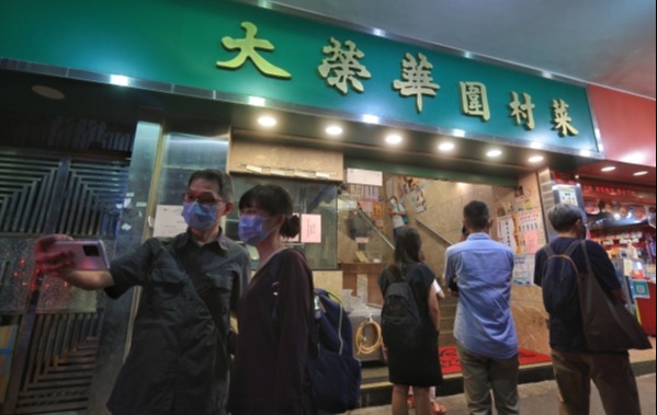 香港新聞網8月28日電(記者 曹文毓)8月28日,香港灣仔大榮華圍村菜結業。大榮華圍村菜由來自香港元朗、人稱“食神”的梁文韜主理,繼去年九龍灣店結業後,灣仔分店在8月28日亦結業。目前,大榮華圍村菜將只剩元朗分店。 綠色招牌,金色字體,與相鄰的榮華餅家紅綠相間,在灣仔史釗域道的十字路口,靜靜迎接它的食客。