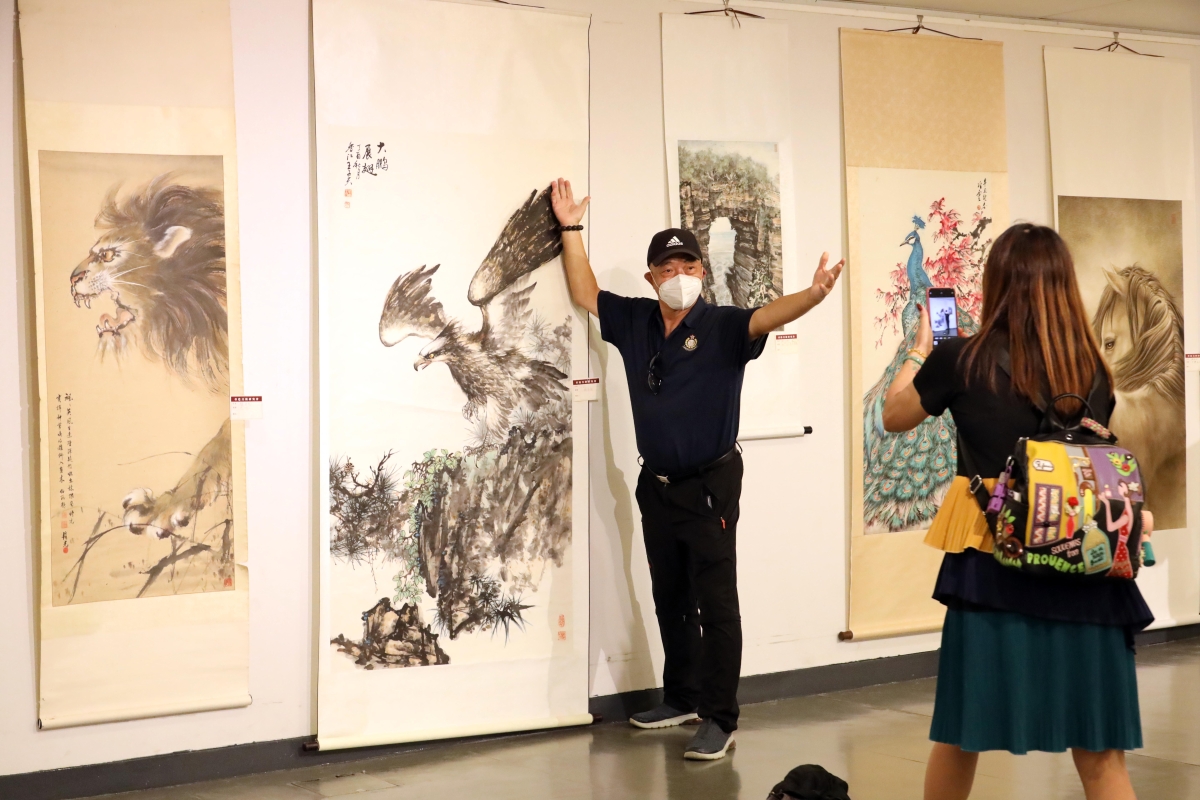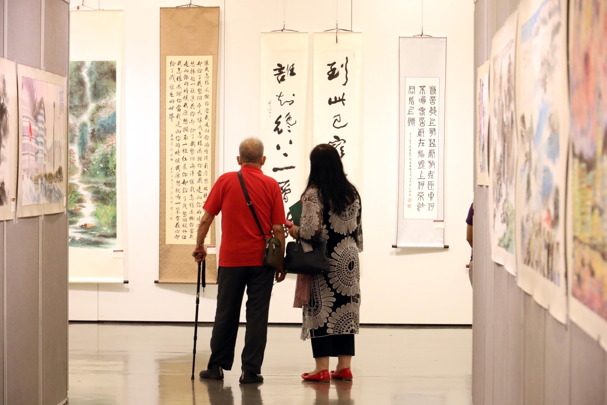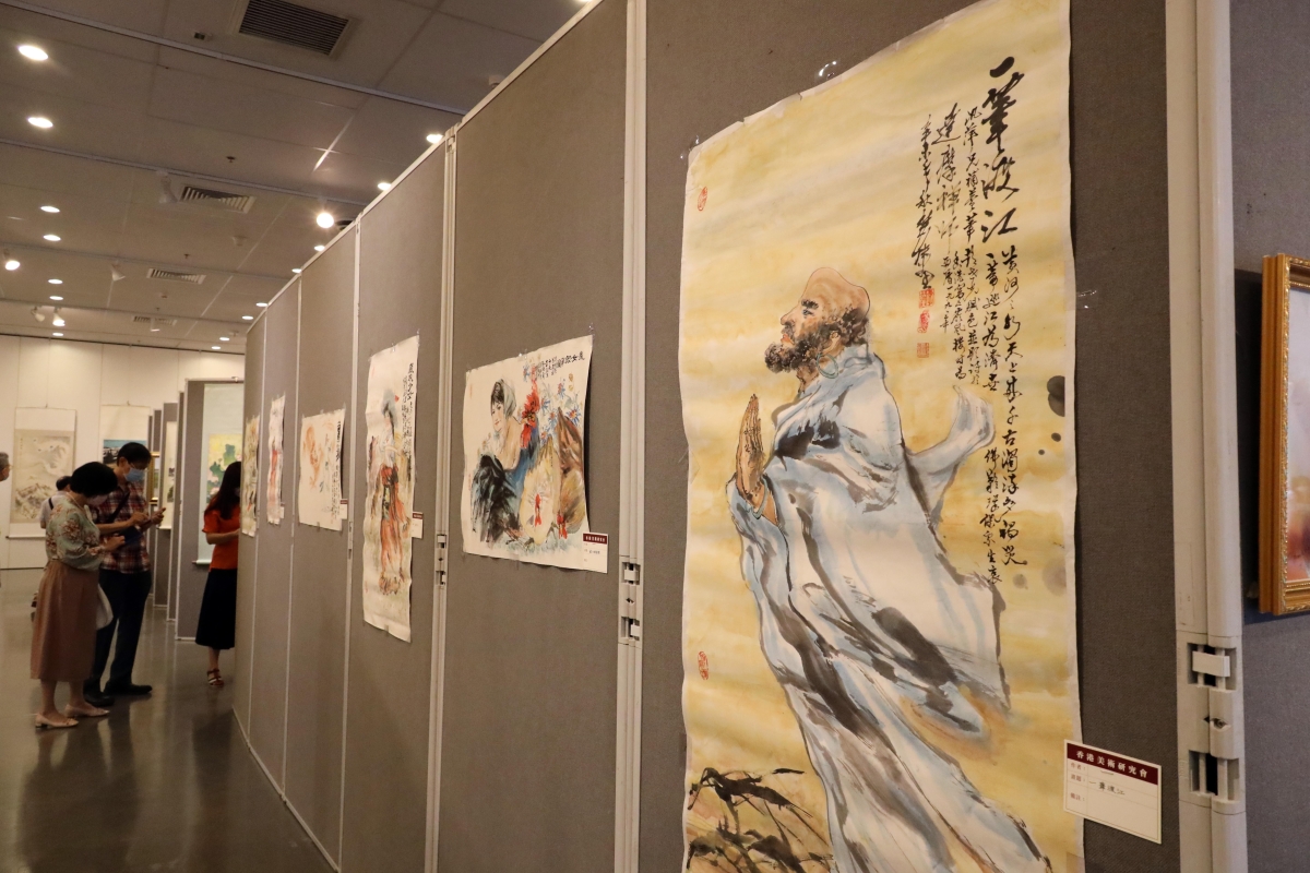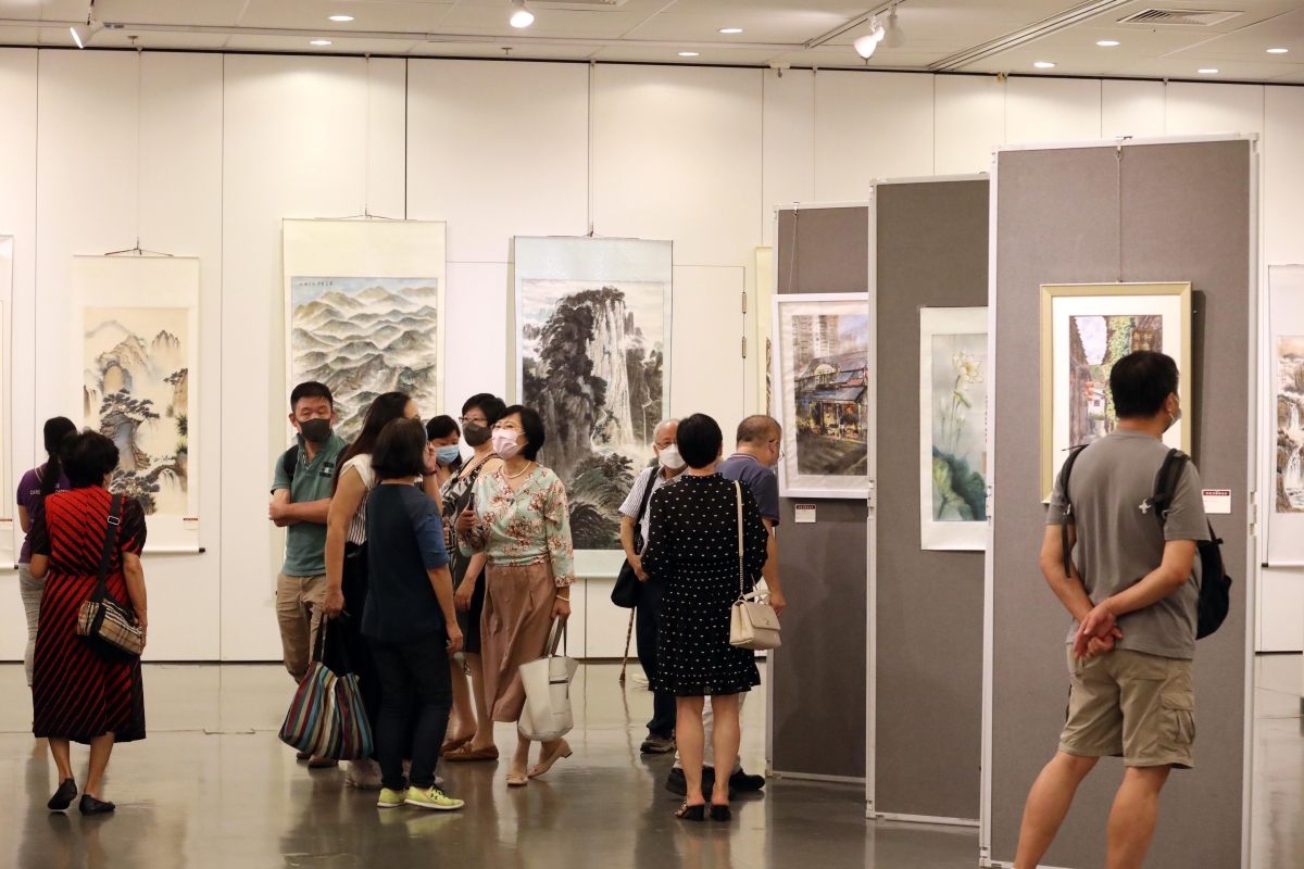 觀眾在欣賞香港美術研究會會員書畫作品。