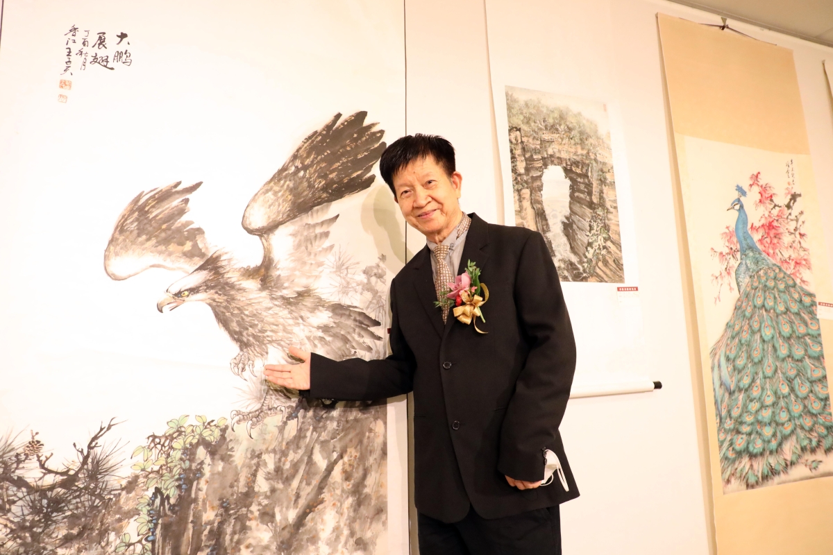 香港美術研究會會長王子天與他的作品《大鵬展翅》。