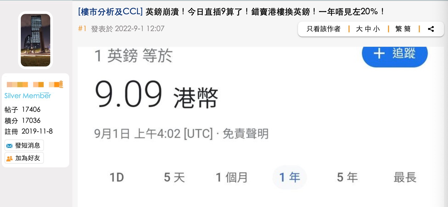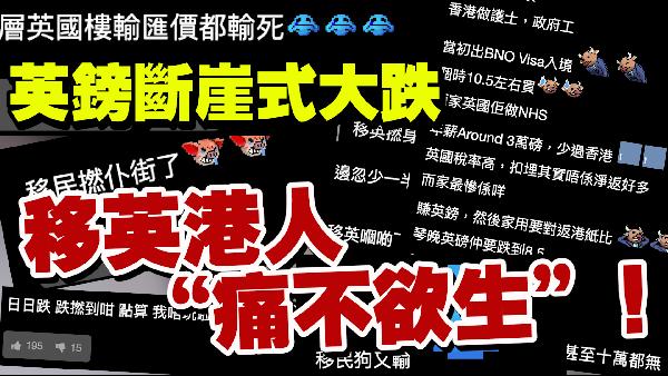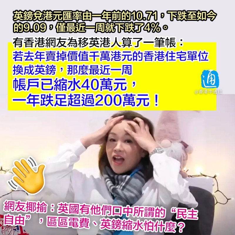 香港新聞網9月1日電 英國經濟不景氣,英鎊持續下跌。有香港網友發現,英鎊兌港元匯率由一年前的10.71,下跌至如今的9.09,僅最近一周就下跌了4%。他為移英港人算了一筆帳,若在去年賣掉價值千萬元(港幣,下同)的香港住宅單位,換成英鎊,那麼最近一周帳戶已縮水40萬元,一年跌足超過200萬元!