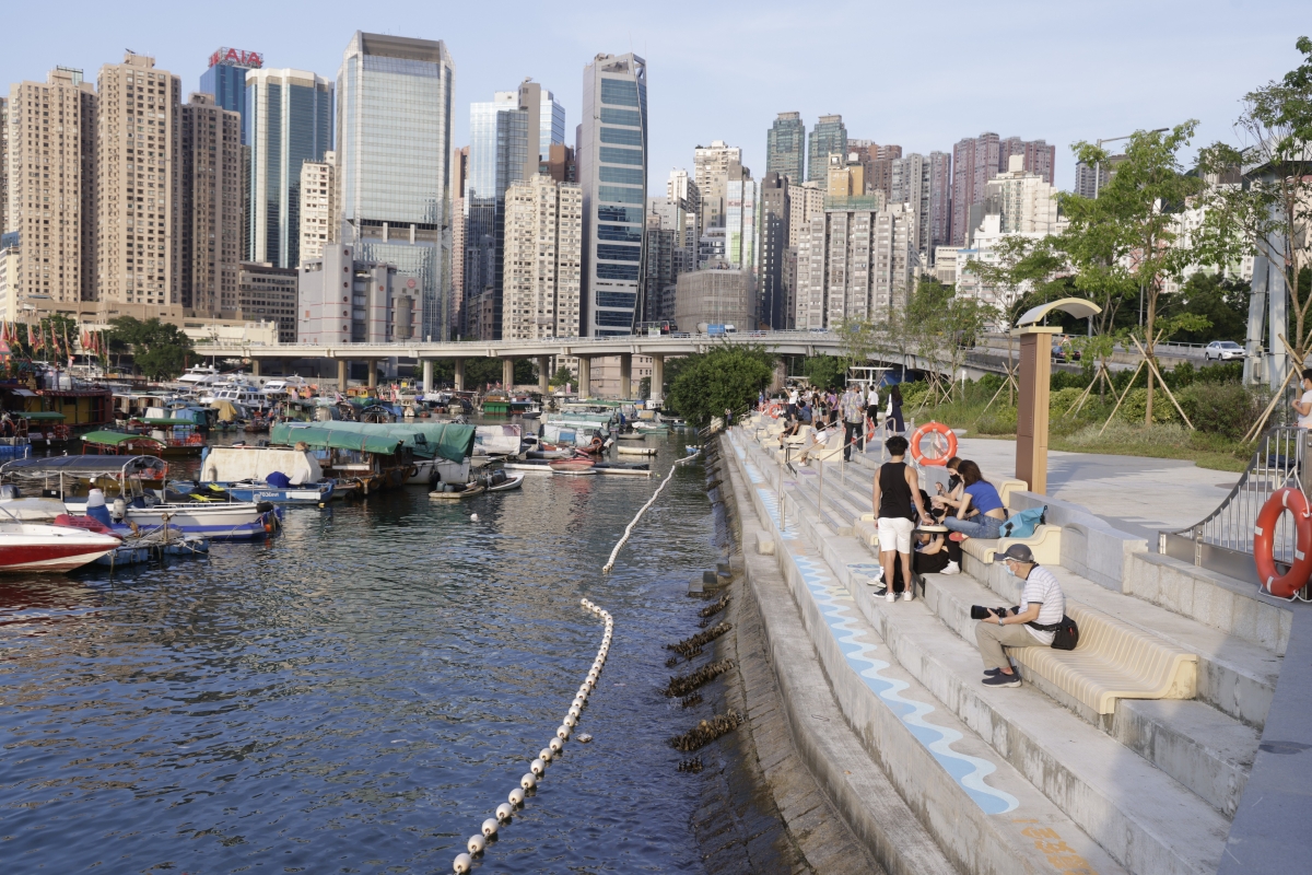 無欄杆的梯級式沿岸讓市民可無阻隔地欣賞避風塘及維港日落景致。
