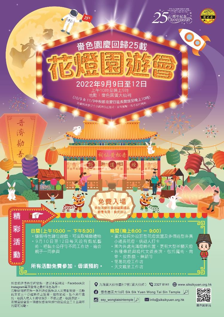 嗇色園慶回歸25載花燈園遊會 六大特色活動與民同樂香港新聞網9月5日電 今年中秋佳節,嗇色園將於9月9日至12日於黃大仙祠舉行“花燈園遊會”,結合中秋花燈晚會及園遊會形式,與廣大市民共慶佳節,同時慶祝香港回歸祖國二十五周年。 活動期間黃大仙祠將每天開放至晚上9:00,而中秋節正日及翌日(即9月10日及11日)更延長開放至晚上10:00。除了在黃大仙祠內外多個位置擺放大型特色花燈及燈飾裝置,亦設有各式各樣免費活動,包括十多場糅合中國傳統文化與現代技藝的文娛表演、懷舊特色攤位遊戲、天文觀星工作坊,及多個手工藝工作坊等,適合男女老幼、一家大細共渡一個愉快的中秋節!