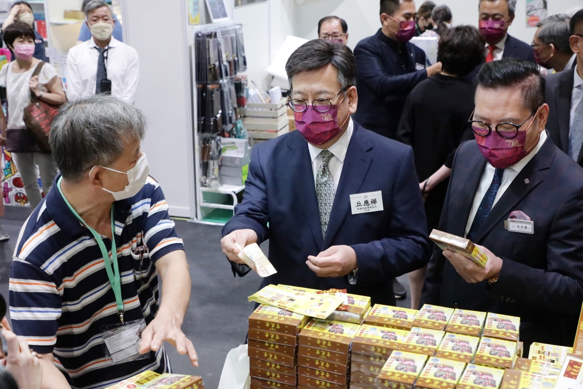 特區商務及經濟發展局局長丘應樺(中)在工展會上購物。