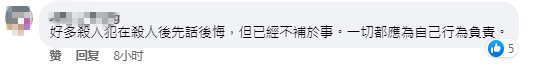 有網友表示,“殺人犯在殺人後才說後悔,但於事無補”,人應為自己的行為負責。